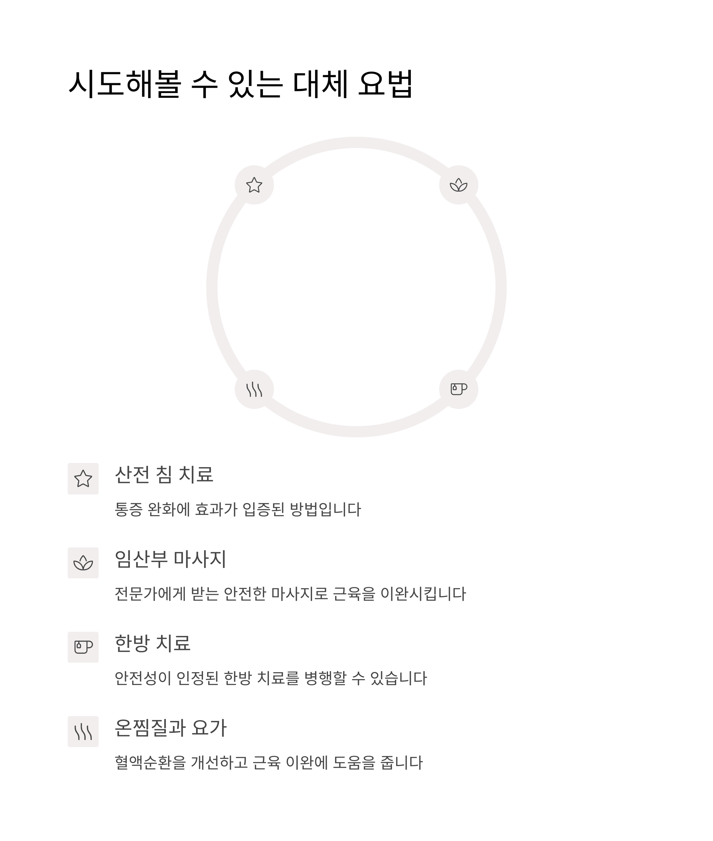 이러한 대체 요법을 시도하기 전에 반드시 산부인과 의사와 상담하여 개인 상황에 맞는 안전한 방법을 선택하세요.