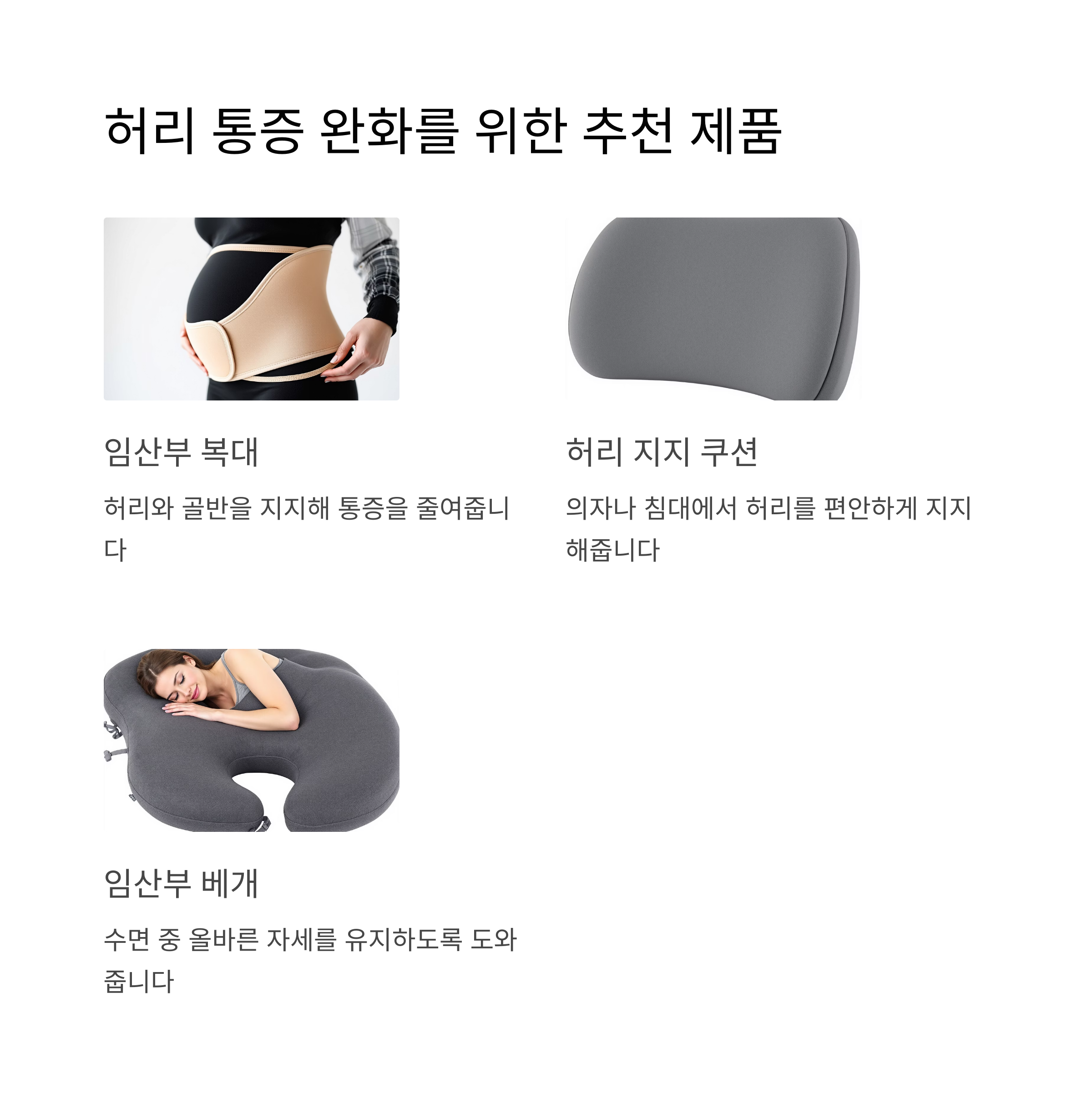 - 임산부용 지지대(Maternity Support Belt): 골반과 하복부를 지지해 허리 부담을 줄여줍니다. 특히 활동량이 많은 날에 유용합니다.