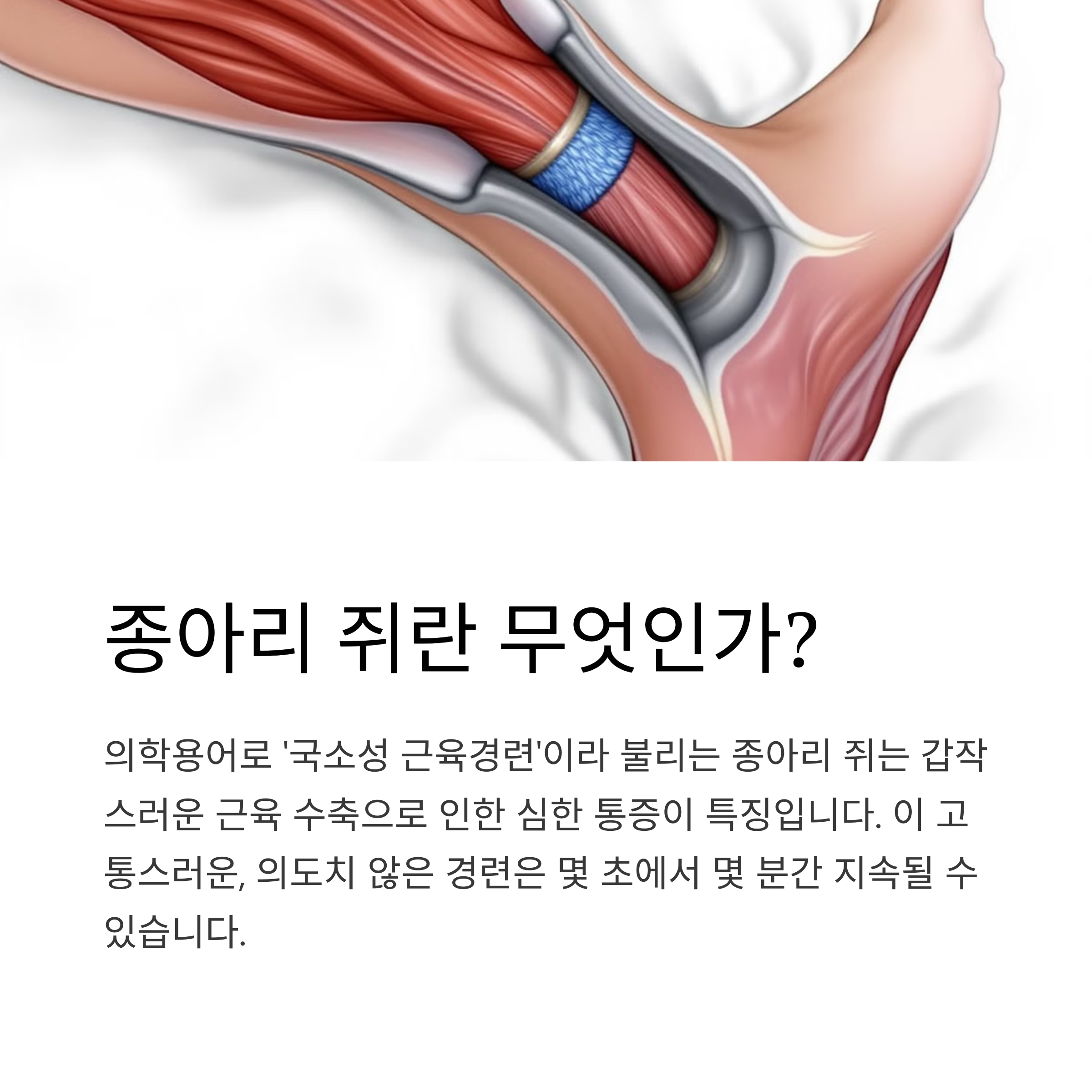 종아리 쥐는 의학적으로 '야간 다리 경련(nocturnal leg cramps)'이라고 불리는 현상으로, 근육이 갑자기 강하게 수축하면서 이완하지 못하는 상태를 말합니다.