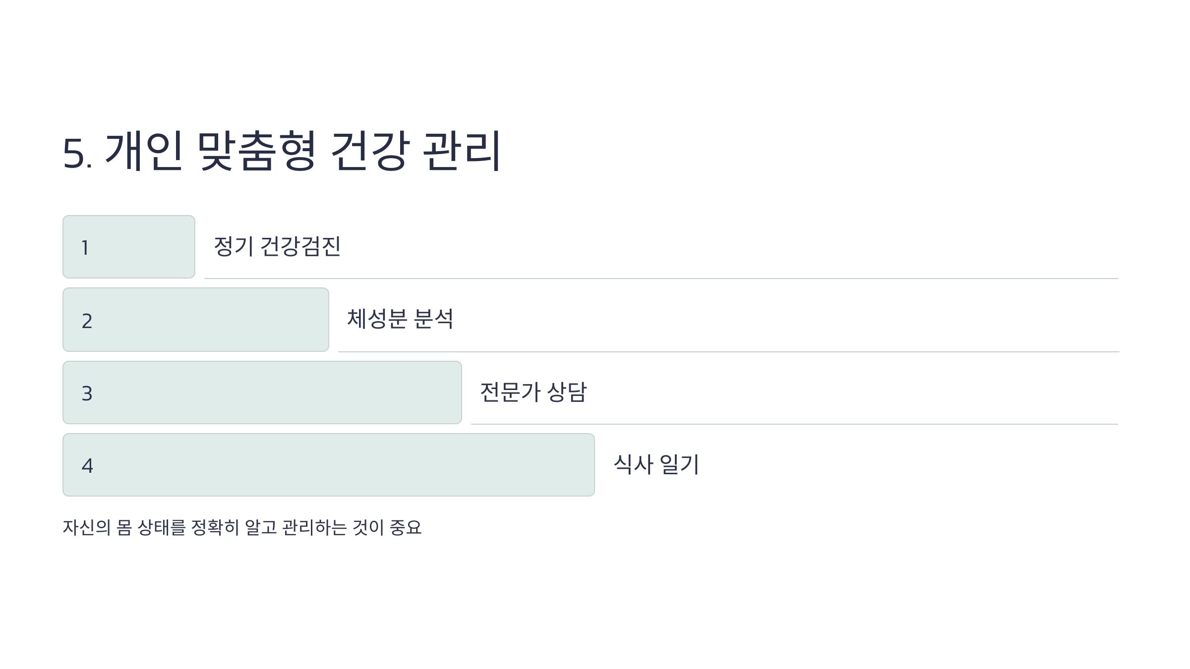 모든 사람에게 똑같이 적용되는 다이어트 방법은 없어요. 자신의 몸 상태를 정확히 알고 관리하는 것이 중요합니다.