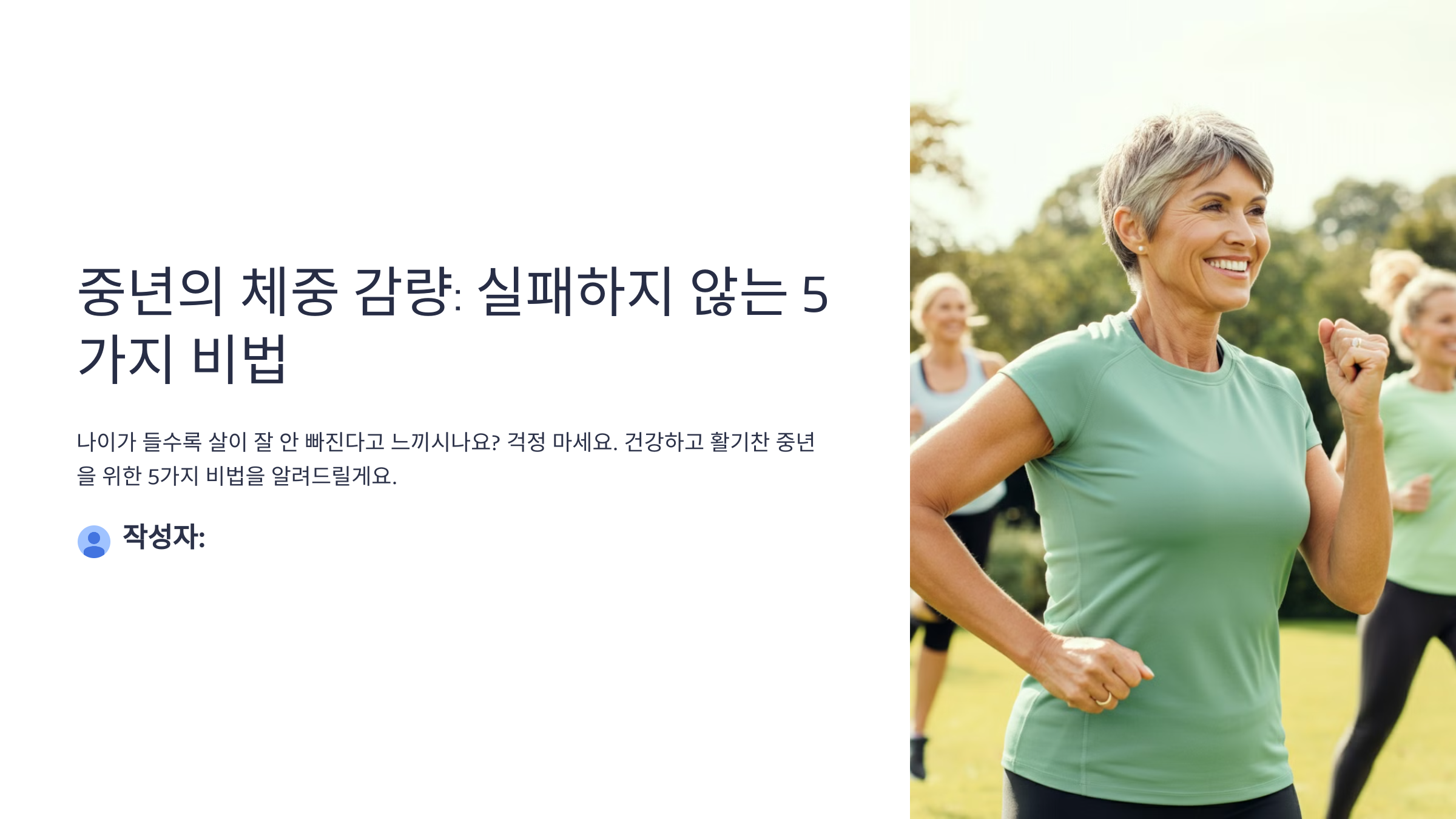 안녕하세요, 여러분! 오늘은 중년의 체중 감량에 대해 자세히 이야기해볼게요. 나이가 들수록 살이 잘 안 빠진다고 느끼시나요? 걱정 마세요. 제가 실패 없는 5가지 비법을 상세히 알려드릴게요. 함께 건강하고 활기찬 중년을 만들어봐요!