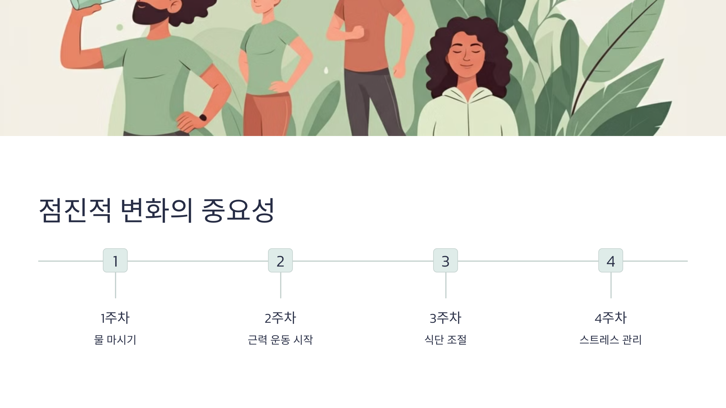 한 번에 모든 것을 바꾸려 하지 마세요. 한 주에 하나씩 새로운 습관을 도입해보는 건 어떨까요? 첫 주는 물 마시기, 다음 주는 근력 운동 시작하기 등으로요. 작은 성공들이 모여 큰 변화를 만들어낼 거예요.