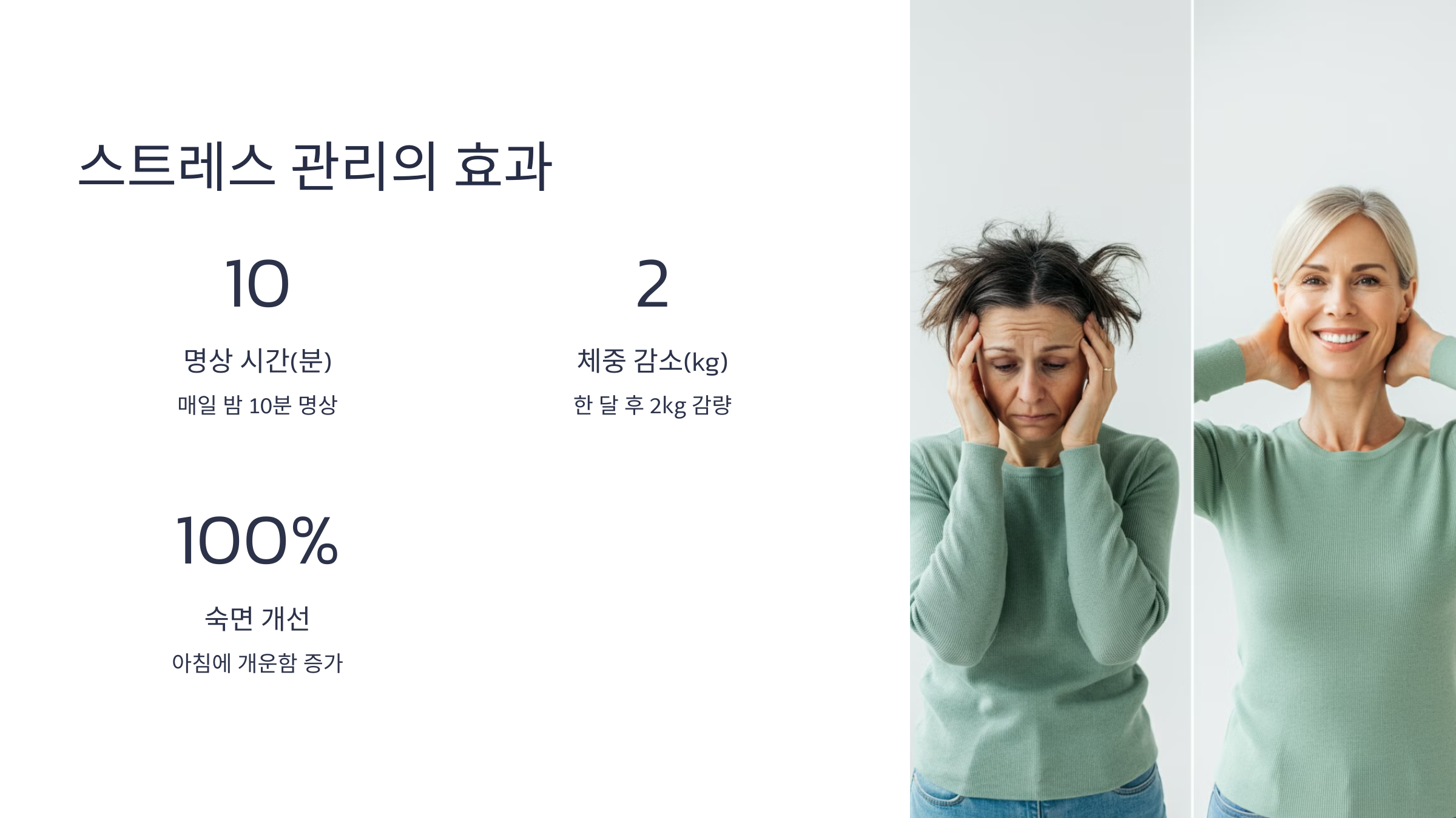예시: 최동훈(57세) 씨는 매일 밤 10분씩 명상을 시작했어요. "처음엔 집중하기 어려웠지만, 꾸준히 하다 보니 마음이 편안해졌어요. 한 달 후, 숙면을 취하게 되었고 불필요한 야식 섭취도 줄었어요. 체중이 2kg 감소했는데, 무엇보다 아침에 일어날 때 개운해요!"