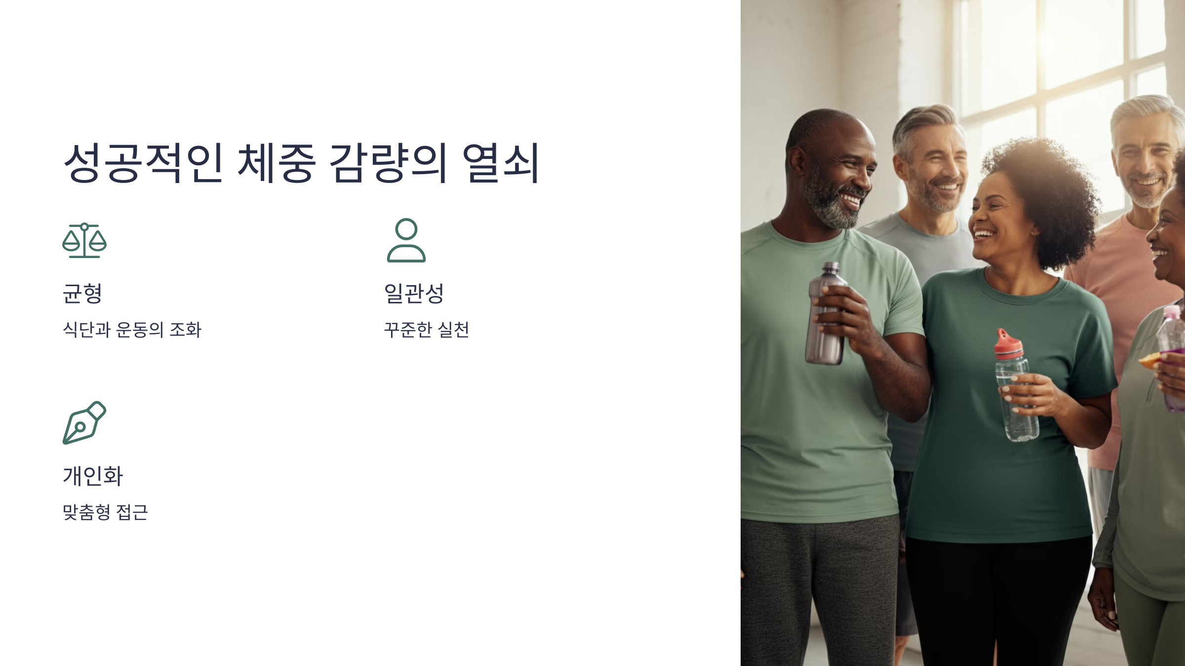 중년의 체중 감량, 어렵지만 불가능하지 않아요! 호르몬 관리, 근력 운동, 균형 잡힌 식단, 스트레스 관리, 개인 맞춤 건강 관리. 이 5가지를 꾸준히 실천해보세요. 작은 변화부터 시작해 건강한 습관을 만들어가는 것이 비결이에요.
