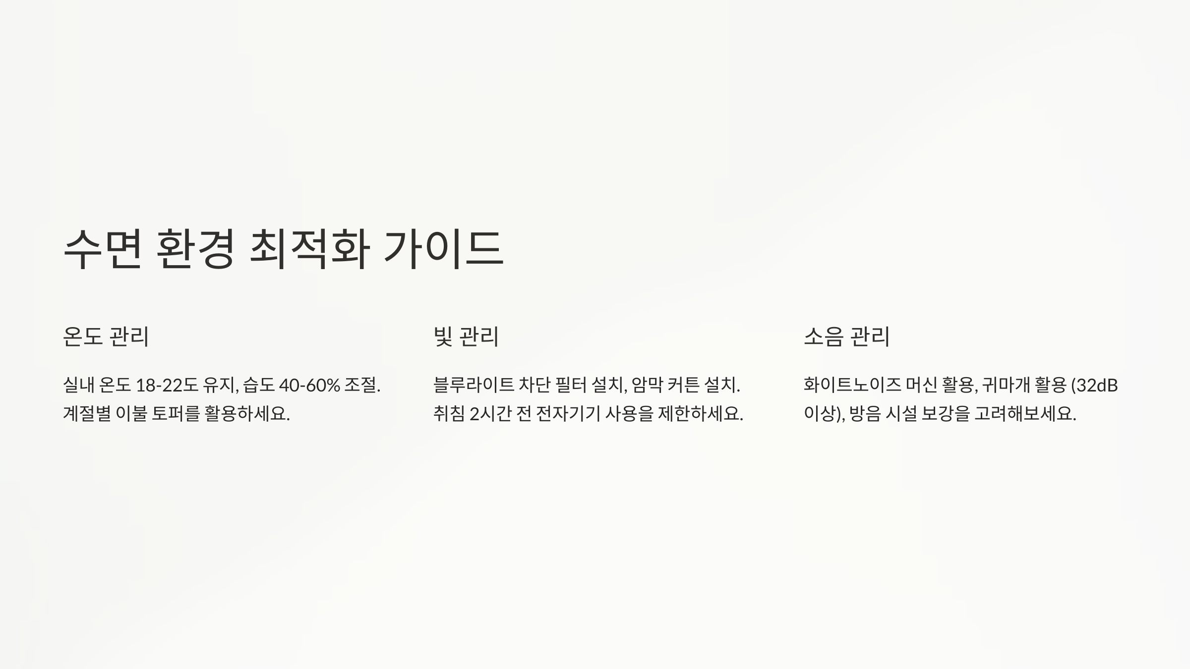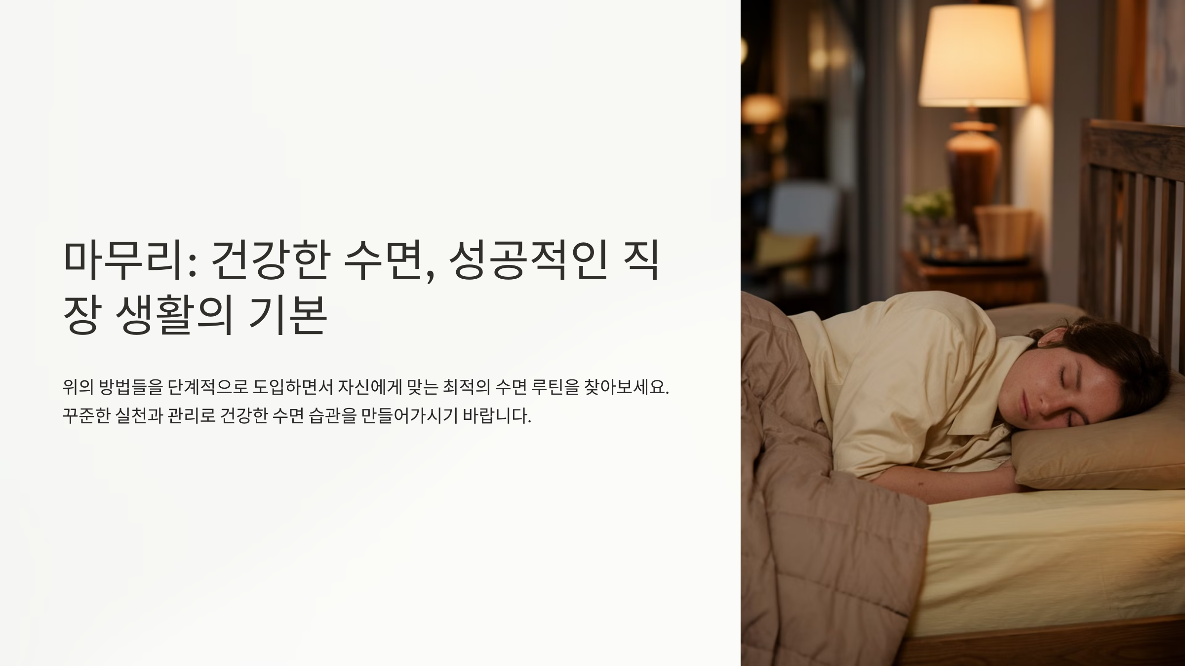 건강한 수면은 성공적인 직장 생활의 기본입니다. 위의 방법들을 단계적으로 도입하면서 자신에게 맞는 최적의 수면 루틴을 찾아보세요. 불면증 극복은 하룻밤에 이루어지지 않습니다. 꾸준한 실천과 관리로 건강한 수면 습관을 만들어가시기 바랍니다.