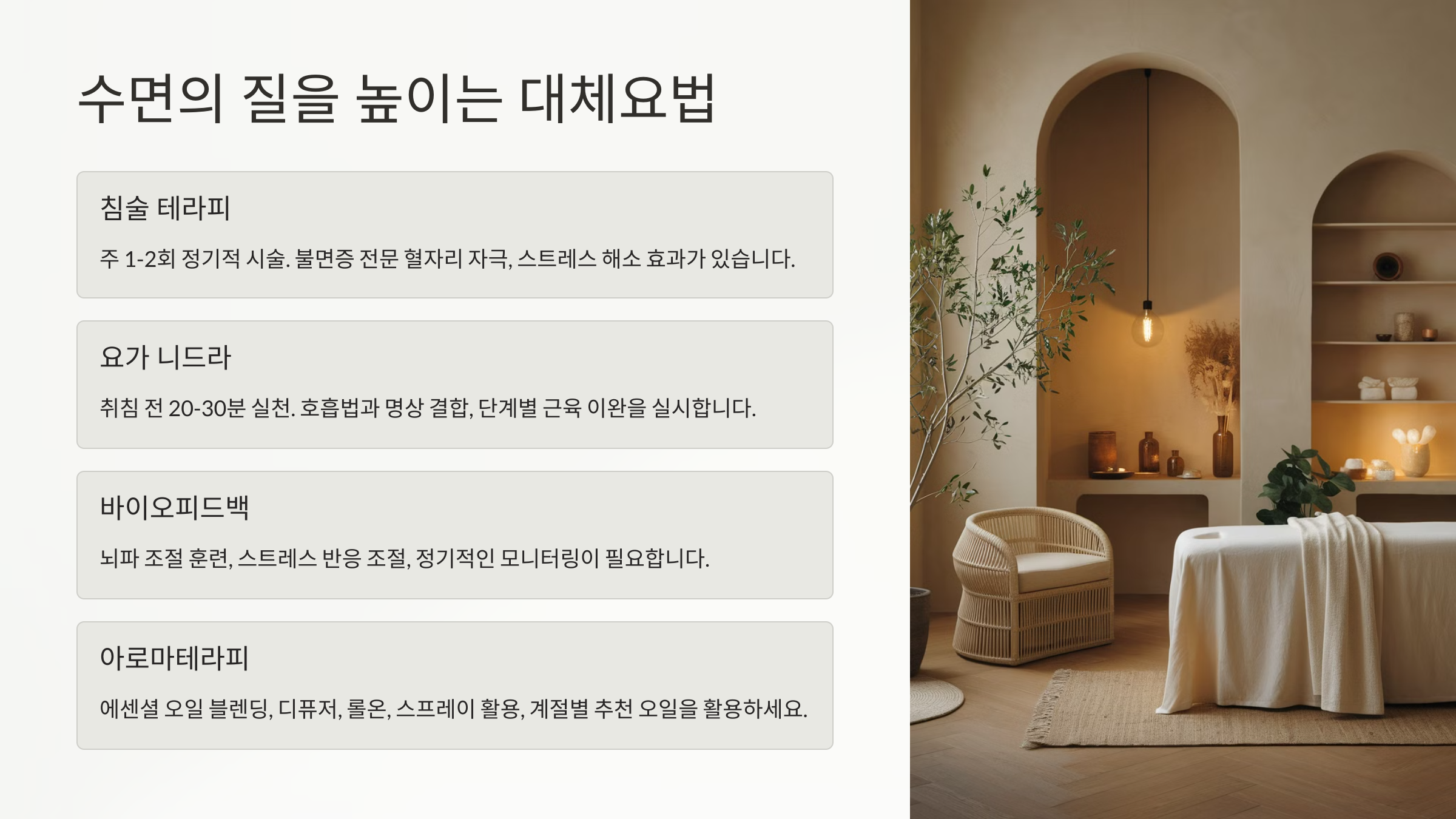 "불면증은 단순한 증상이 아닌 현대인의 건강을 위협하는 심각한 문제입니다. 자연 치료법을 통한 점진적인 개선이 가장 이상적입니다. 특히 직장인의 경우, 업무 스트레스와 불규칙한 생활습관이 주요 원인이므로, 생활 전반의 균형 잡힌 관리가 필요합니다."
