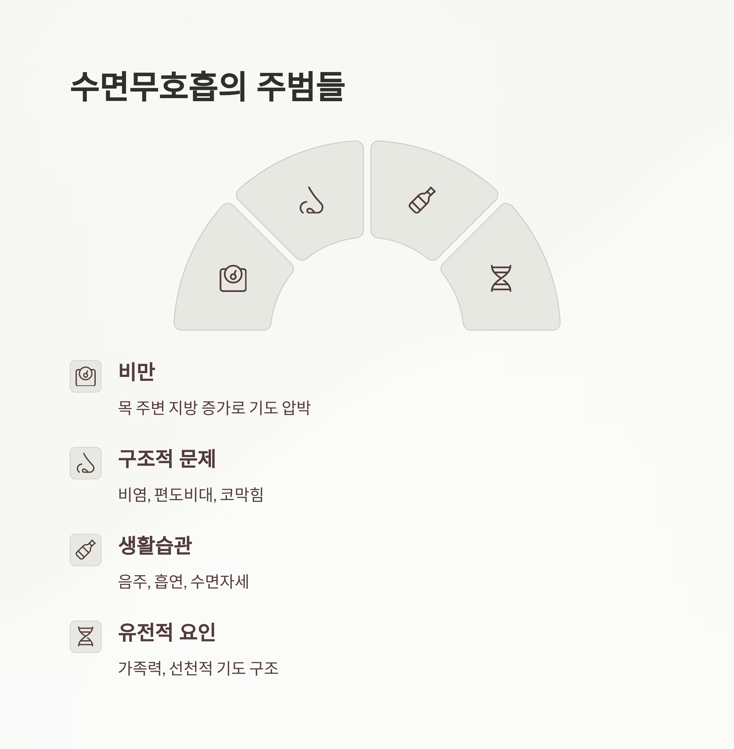 - 비만: 목 주변에 지방이 쌓이면 기도가 좁아질 수 있어요.
