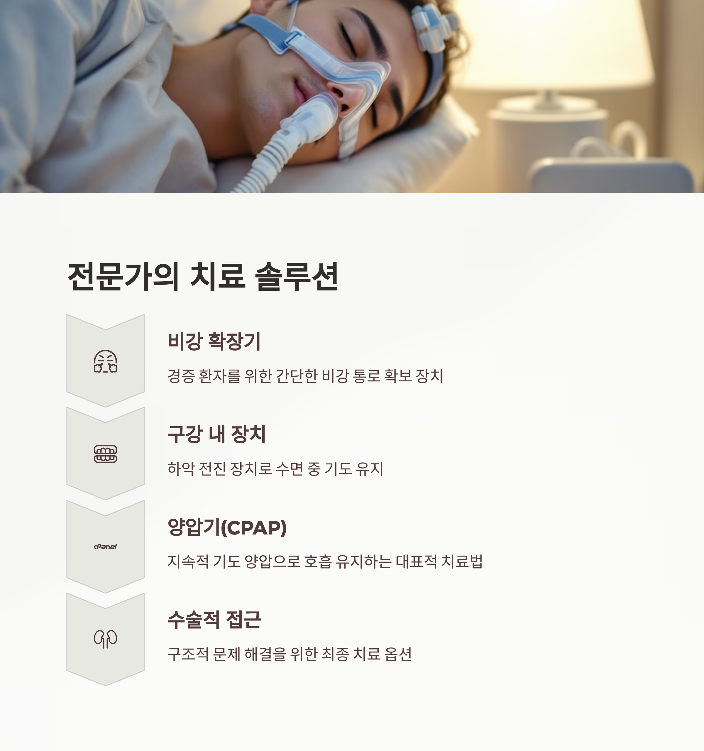 - 수술적 치료: 코 수술, 구개 수술 등 원인에 따라 다양한 수술 방법이 있어요.