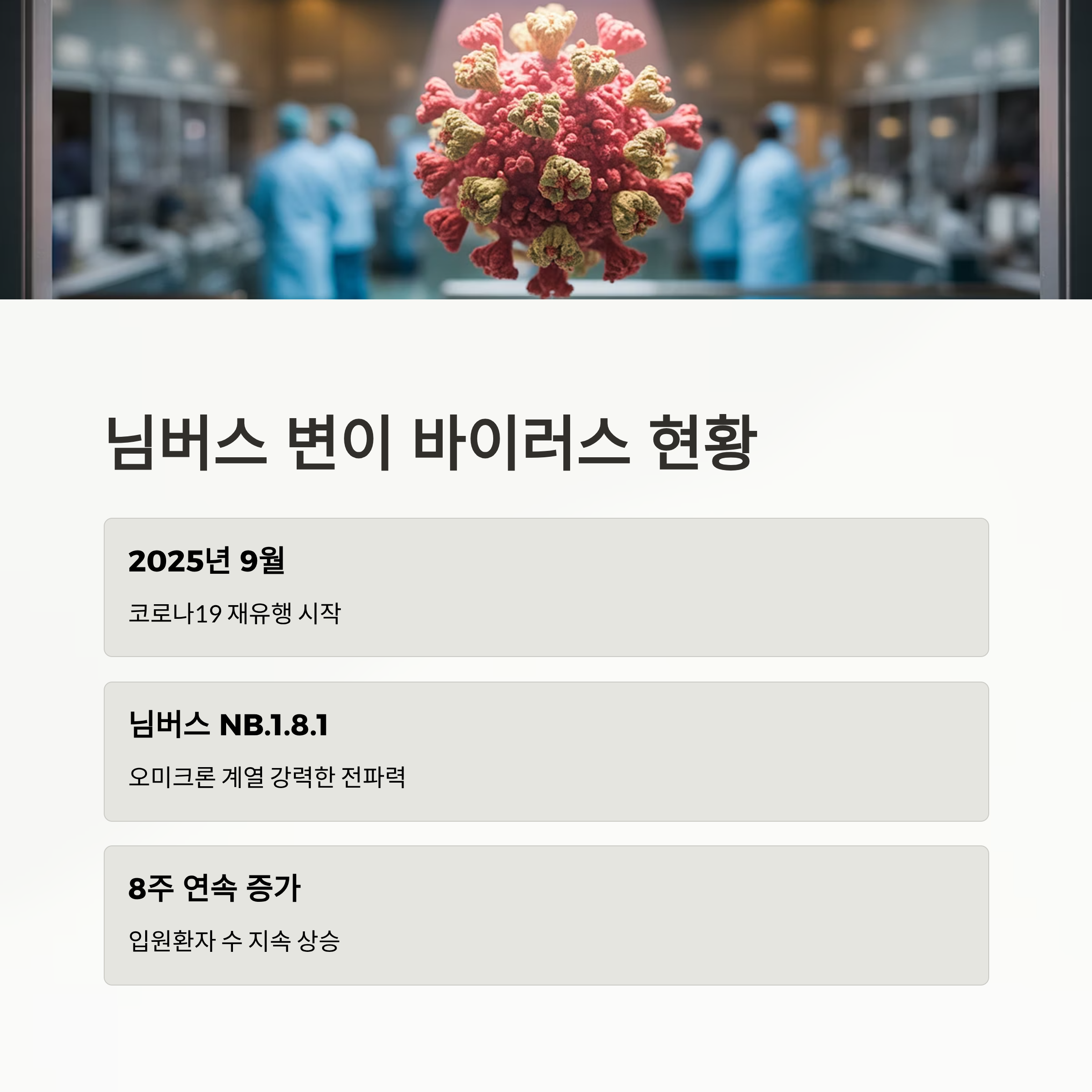 2025년 9월, 다소 잠잠했던 코로나19가 다시 확산세에 있습니다. 주요 원인은 전파력이 강한 오미크론 계열 변이 바이러스 '님버스'로, 학교 개학과 여름 휴가철 이동량 증가가 감염 확산을 부추기고 있습니다.