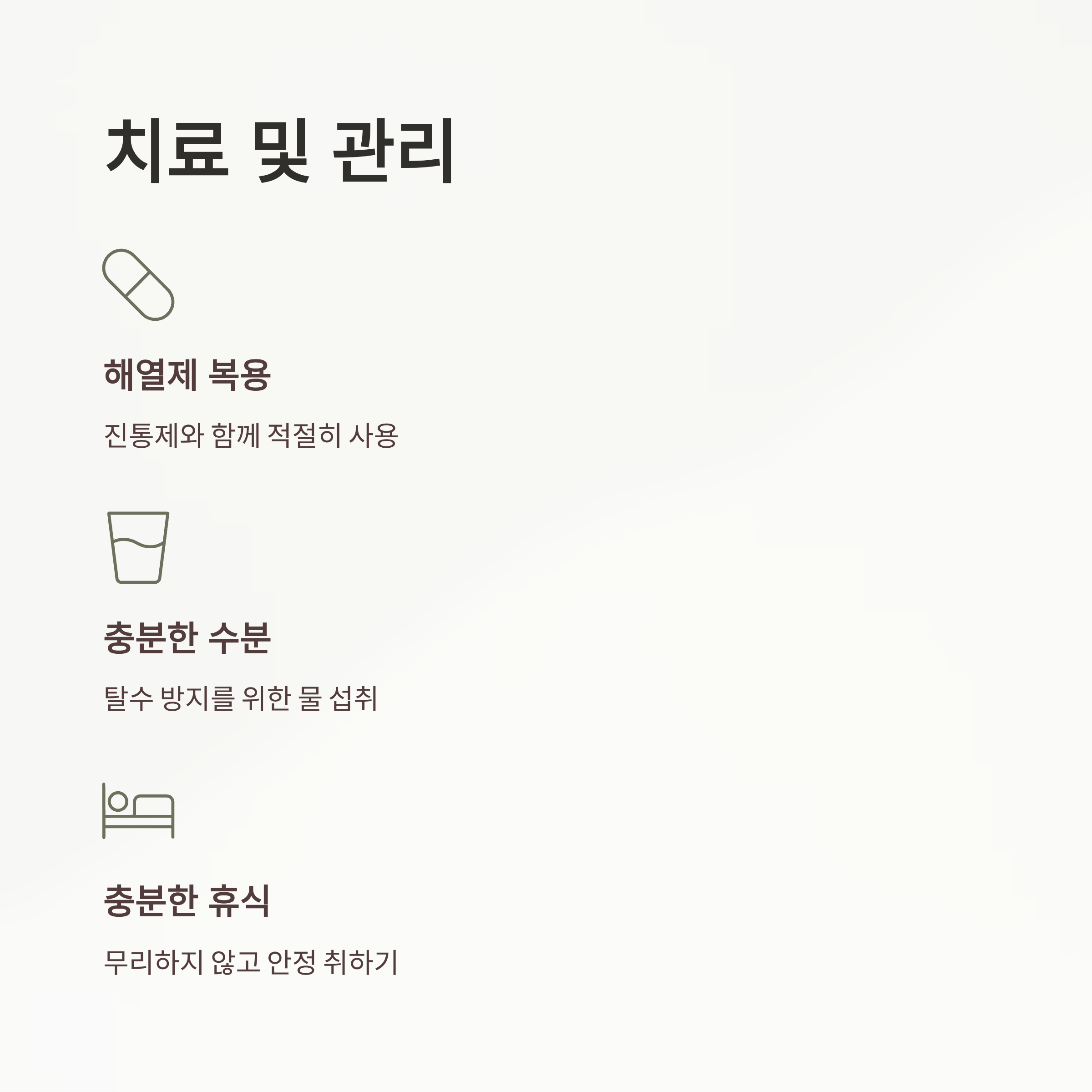 해열제 및 진통제 복용과 수분 섭취를 충분히 하면서 무리하지 않고 휴식하는 것이 중요합니다.