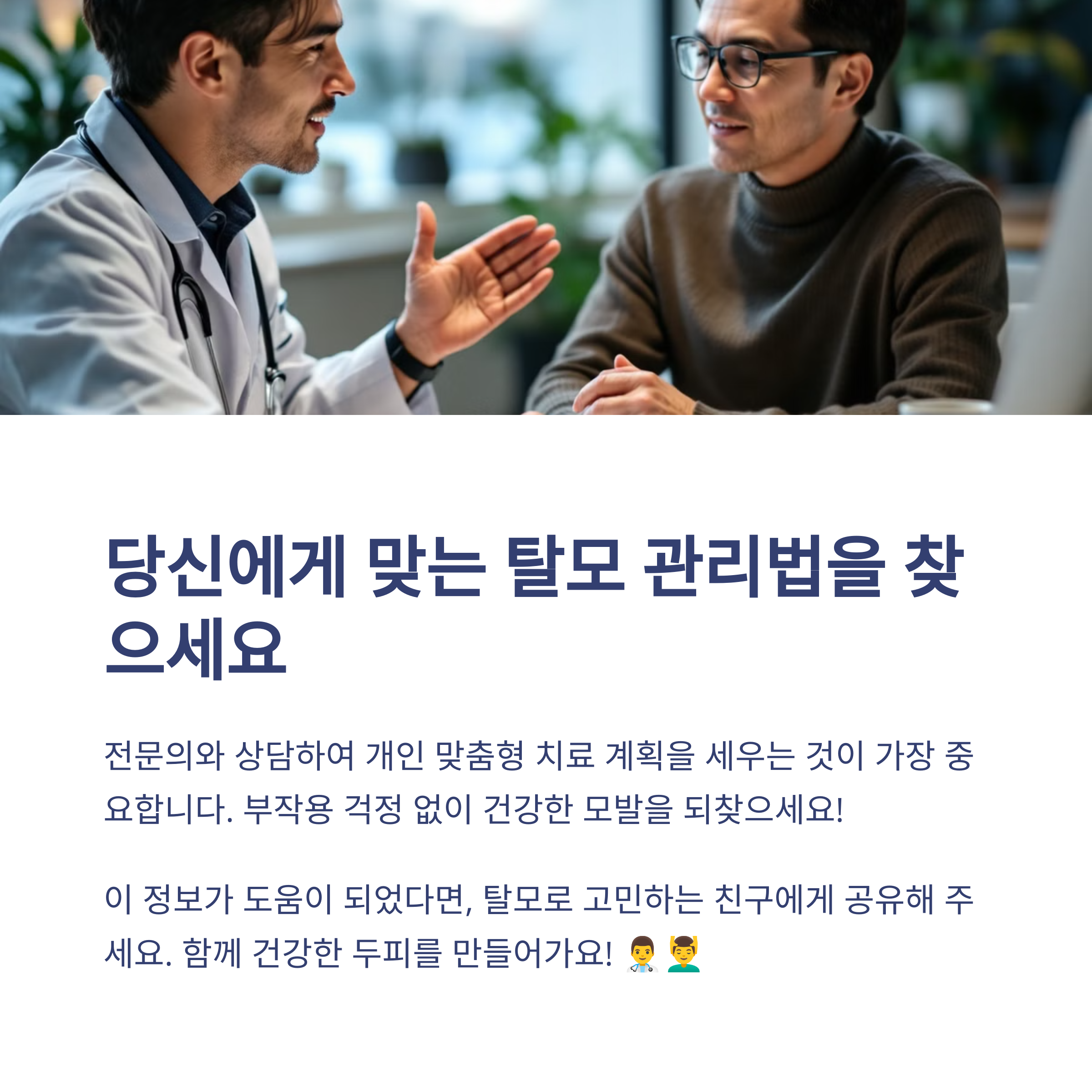 여러분의 탈모 치료 경험이나 궁금한 점이 있다면 댓글로 남겨주세요. 건강한 모발로 자신감을 되찾는 여정을 함께 하겠습니다!