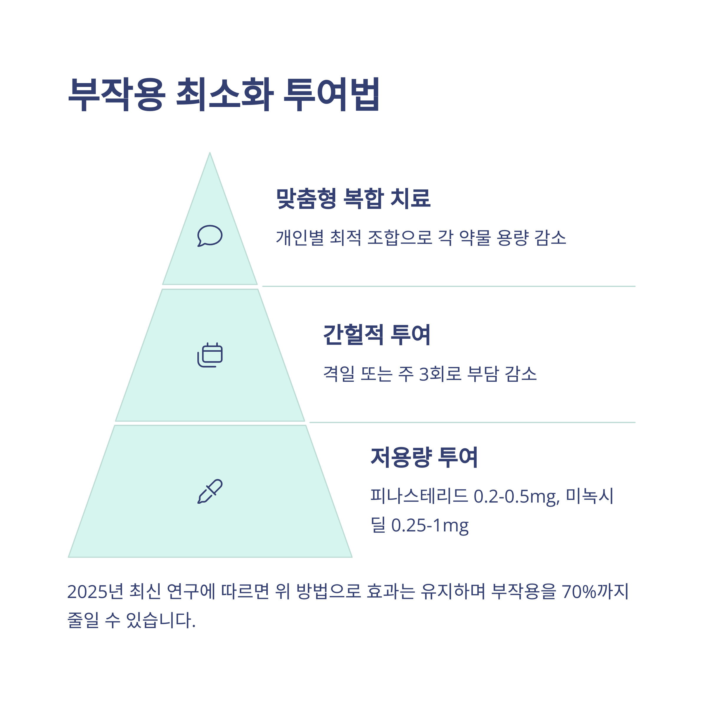 2025년 현재, 탈모약의 효과는 유지하면서 부작용을 최소화하는 다양한 투여법이 연구되고 있습니다. 다음은 최신 연구에 기반한 5가지 효과적인 방법입니다.