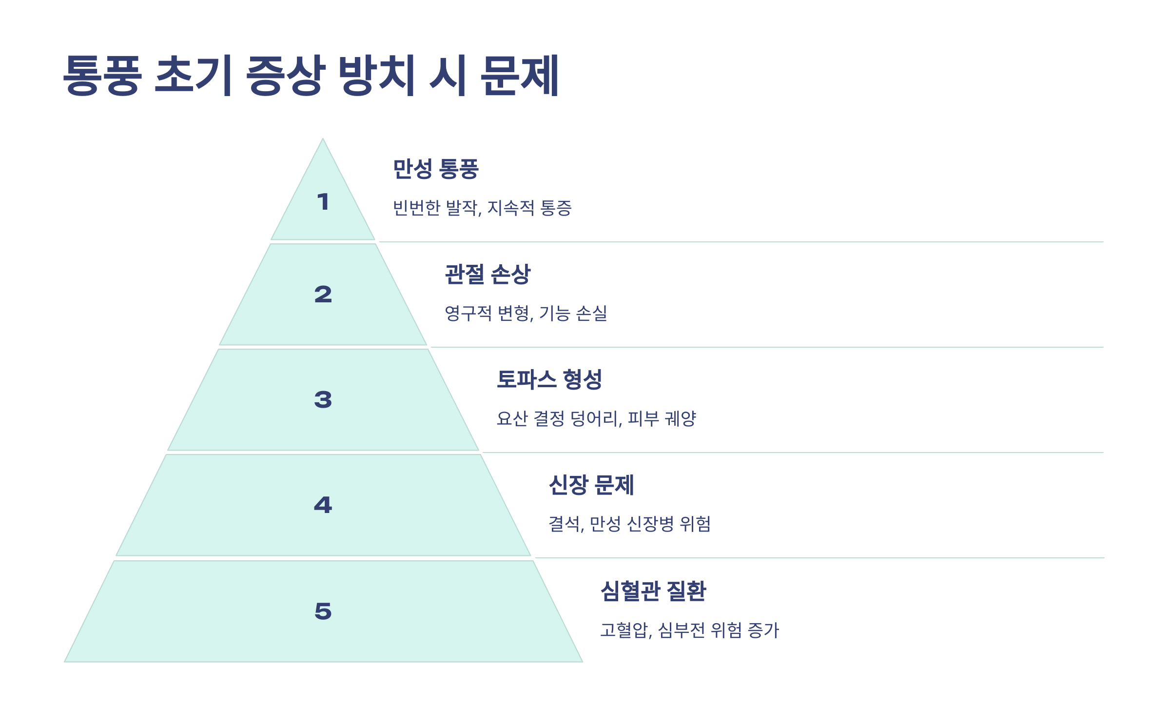 통풍의 초기 증상을 무시하거나 적절히 관리하지 않으면 심각한 합병증으로 이어질 수 있습니다. 다음은 통풍을 방치했을 때 발생할 수 있는 주요 문제들입니다:
