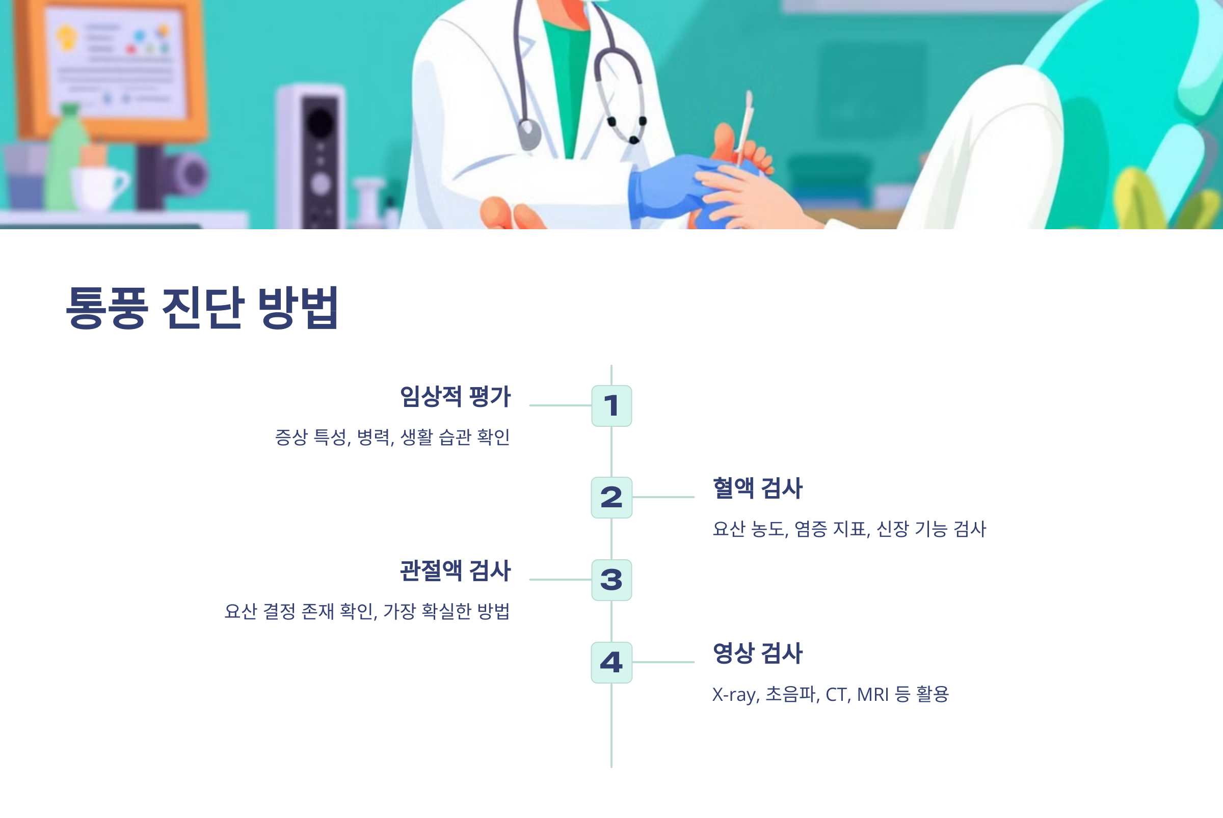 통풍의 정확한 진단은 매우 중요합니다. 초기 증상이 다른 관절 질환과 유사할 수 있기 때문에, 전문의의 정확한 진단이 필요합니다. 다음은 통풍을 진단하는 주요 방법들입니다: