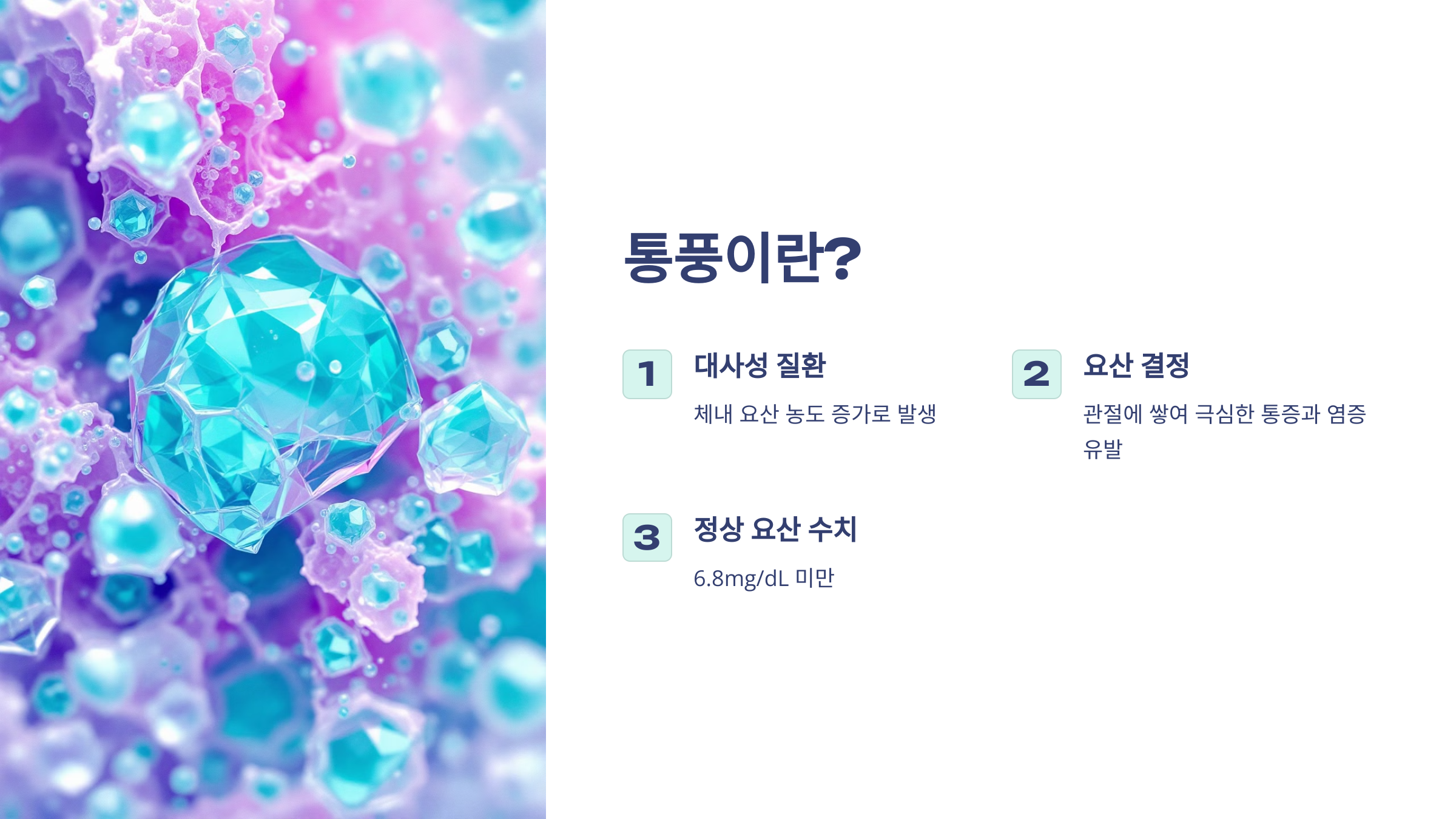 통풍은 체내 요산(uric acid) 농도가 높아져 발생하는 대사성 질환입니다. 요산은 우리 몸에서 퓨린(purine)이라는 물질이 분해될 때 생성되는 부산물입니다. 정상적인 상황에서는 신장을 통해 소변으로 배출되지만, 요산 수치가 높아지면 결정 형태로 관절에 쌓여 극심한 통증과 염증을 유발합니다.