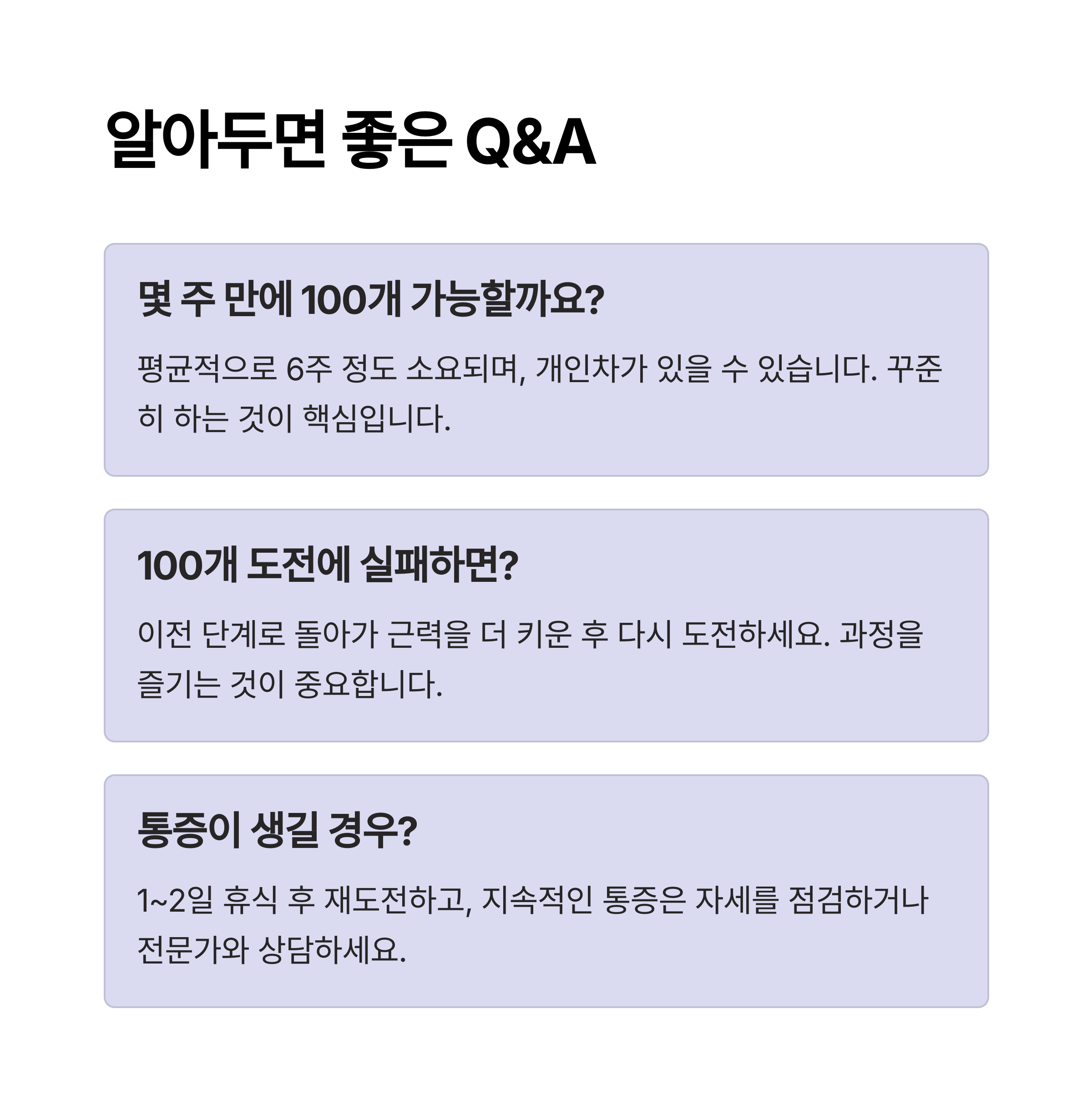 매일 100개 루틴을 반복할 경우 피로가 누적될 수 있어요. 적절히 세트를 나누어 수행하고 충분한 휴식을 취하는 것이 중요합니다.