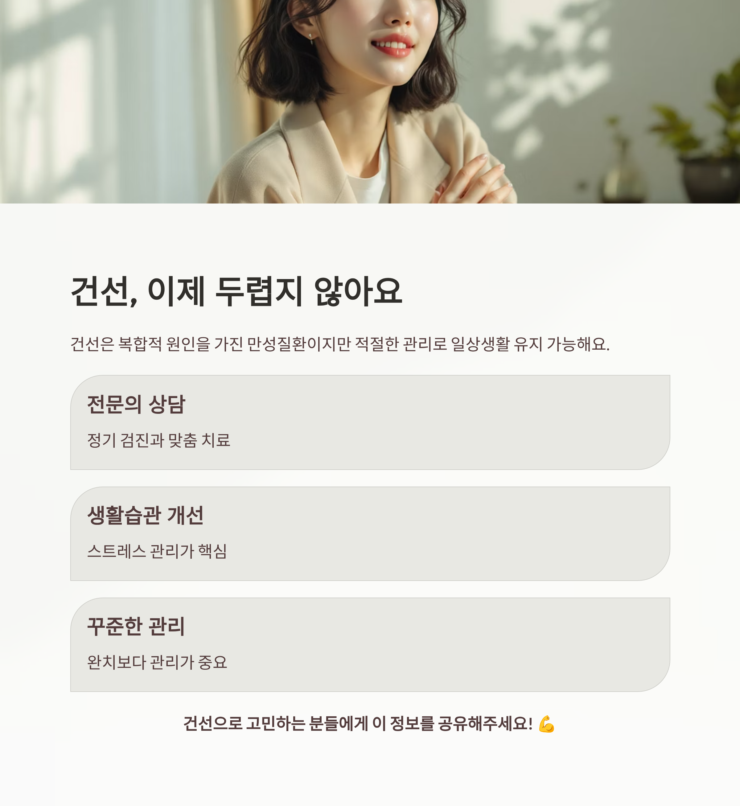 제가 건선과 함께 살아가면서 느낀 점은, 원인을 정확히 알고 대처법을 익히면 충분히 일상생활을 유지할 수 있다는 거예요. 무엇보다 스트레스 관리와 규칙적인 생활습관이 약물 치료만큼 중요하다는 걸 꼭 기억하세요.