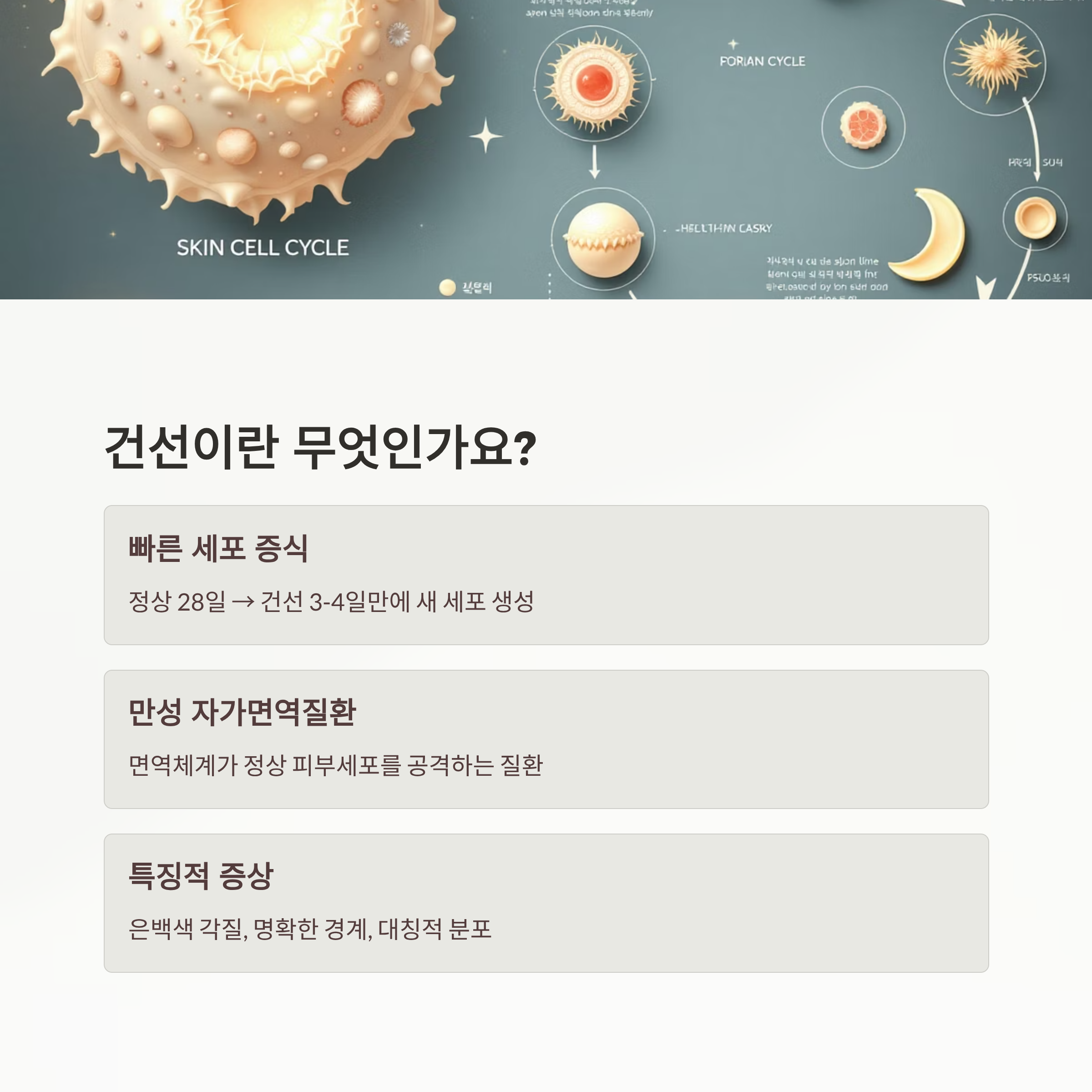 건선은 피부 세포가 정상보다 빠르게 증식하면서 발생하는 만성 자가면역 질환입니다. 정상적인 피부 세포 교체 주기가 28일인데 반해, 건선 환자의 경우 3-4일 만에 새로운 세포가 생성되어 각질이 두껍게 쌓이게 되는 거죠.