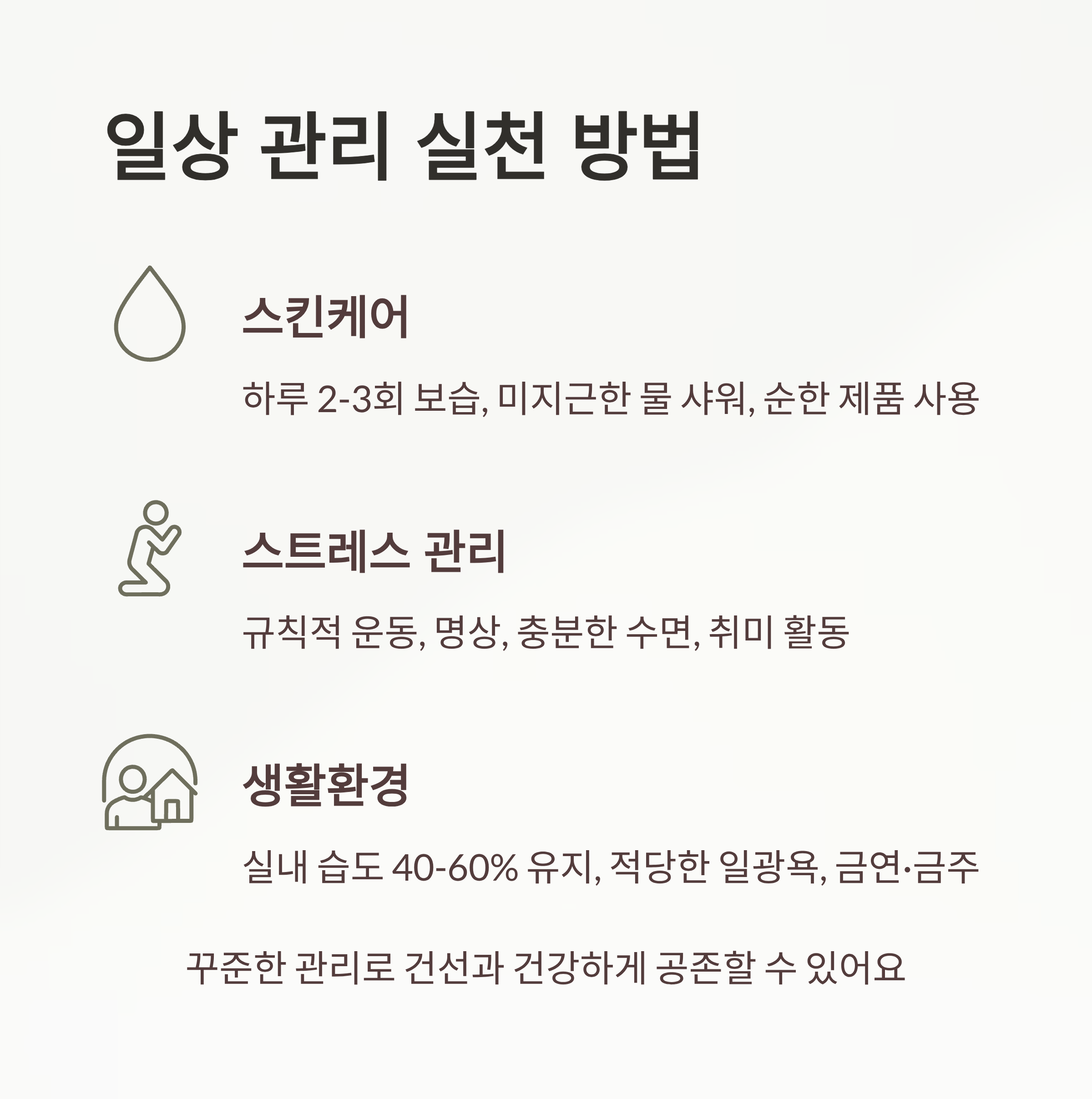 지금까지 다양한 건선 원인들을 살펴봤는데, 실제 일상생활에서 이런 악화 요인들을 어떻게 관리하고 예방할 수 있는지가 가장 중요한 부분이에요. 제가 지난 몇 년간 시행착오를 겪으며 터득한 관리법들을 공유해드릴게요.
