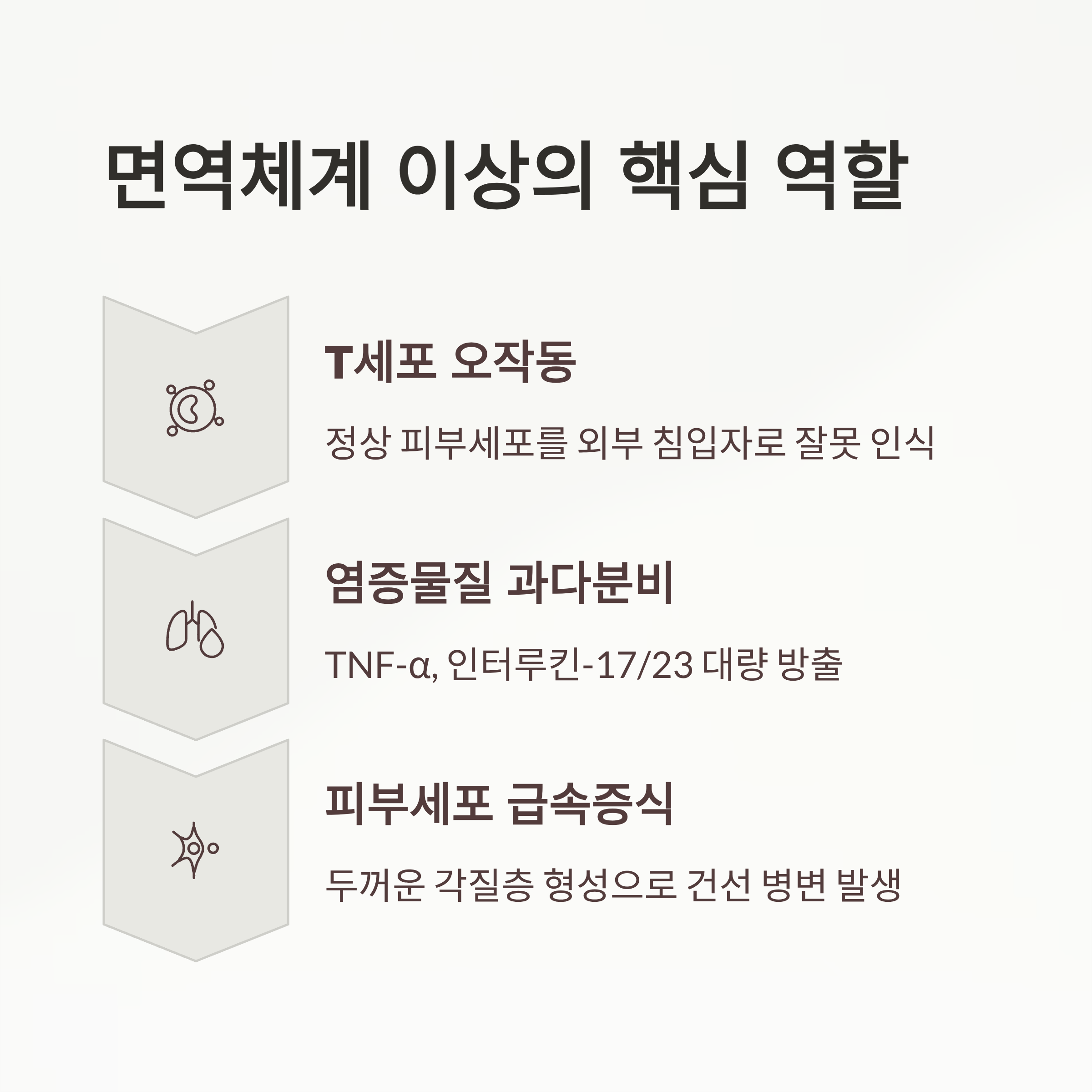 건선의 가장 핵심적인 원인은 바로 면역체계의 과도한 반응입니다. 우리 몸의 면역세포인 T세포가 정상 피부세포를 외부 침입자로 잘못 인식해서 공격하는 자가면역 반응이 일어나는 거예요.