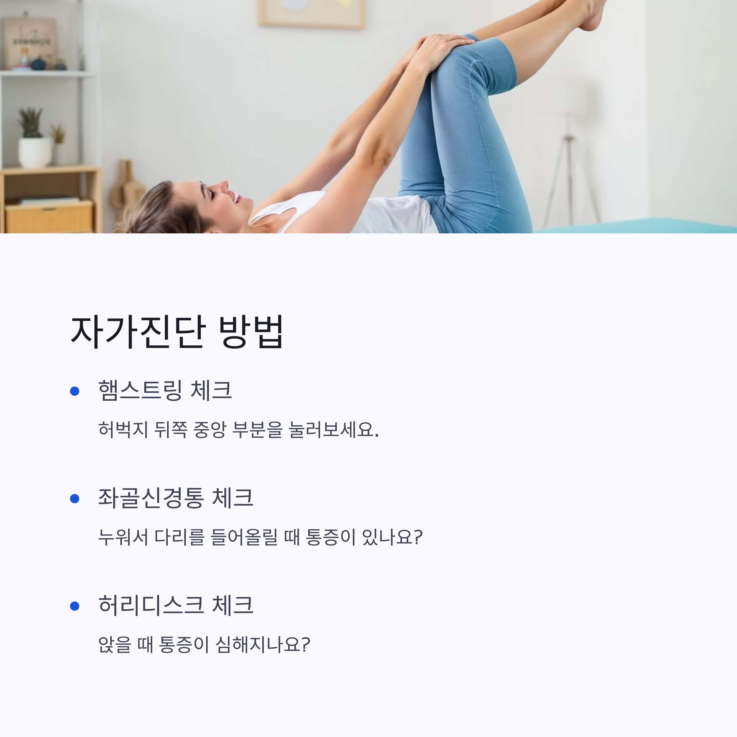 - 허벅지 뒤쪽 중앙 부분을 누르면 통증이 심해짐