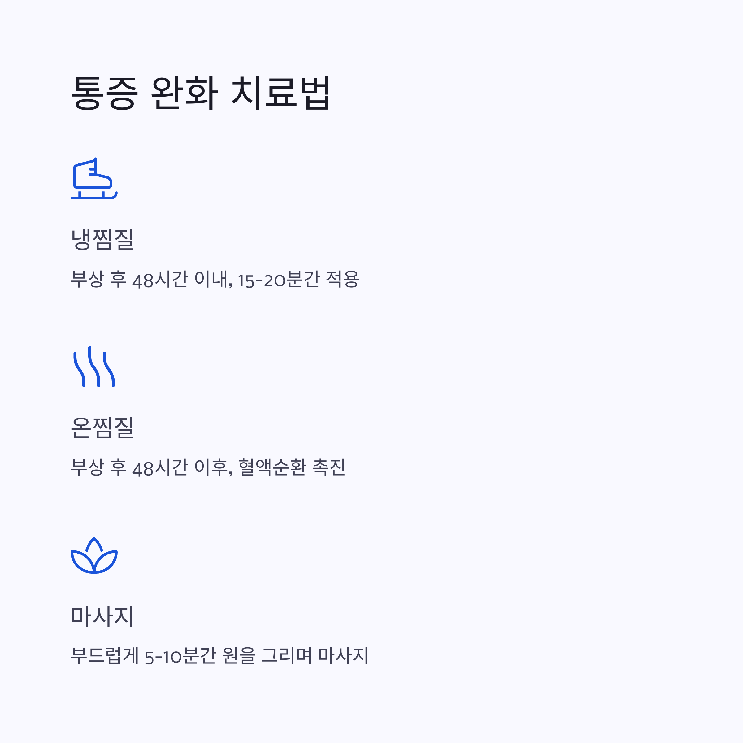 A. 부상 초기 48시간 이내에는 냉찜질, 그 이후 만성적인 통증에는 온찜질이 효과적이에요. 본인에게 더 편안한 느낌을 주는 것을 선택하세요.