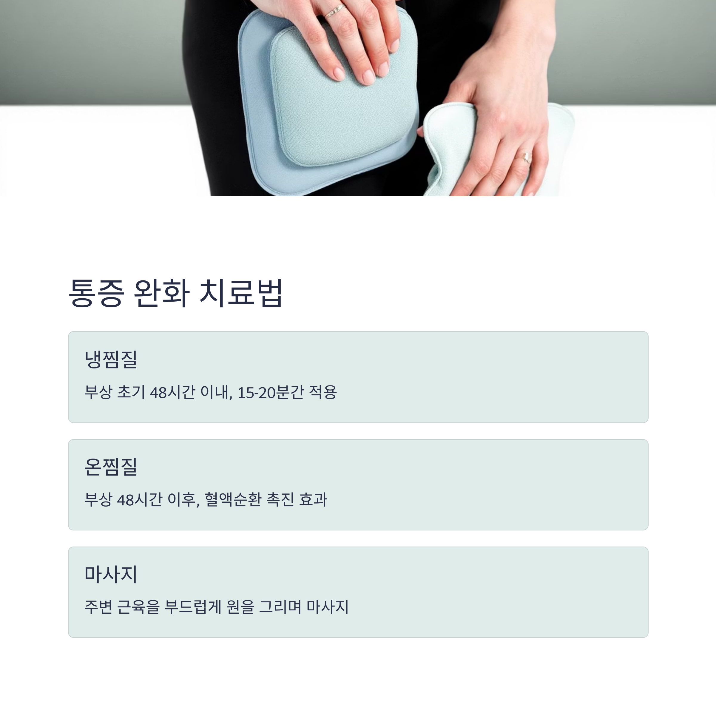 통증 초기에는 냉찜질이, 만성적인 통증에는 온찜질이 효과적이에요[7]. 냉찜질 방법: