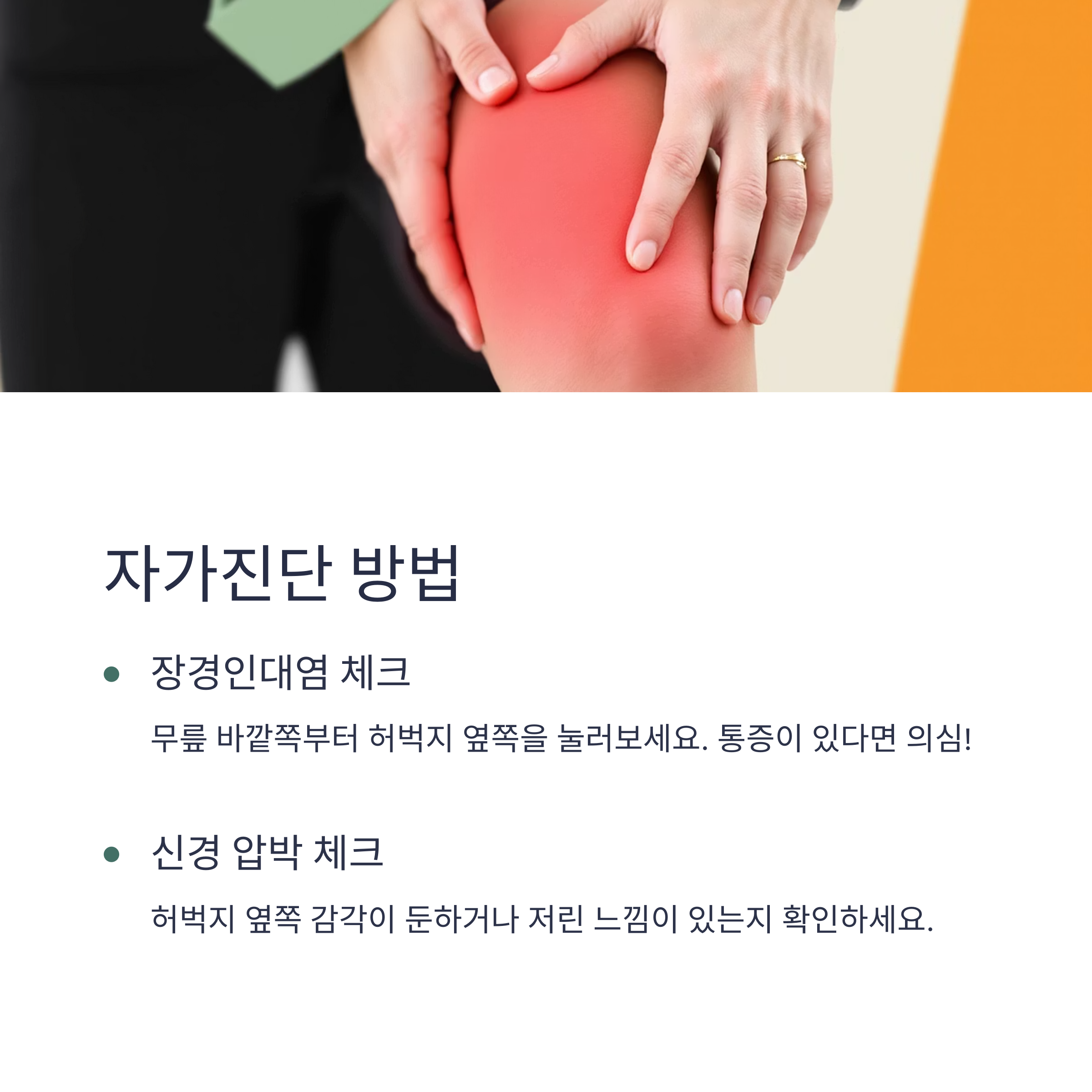 달리기나 사이클 같은 반복적인 운동, 잘못된 자세로 오래 앉아 있는 습관이 주요 원인이 될 수 있어요[1][8]. 장경인대염의 특징적인 증상들: