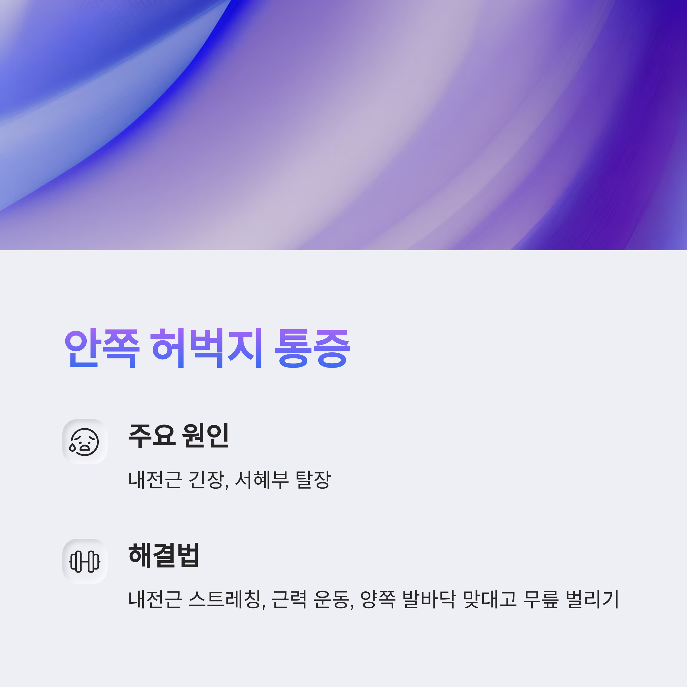 고관절의 관절염이 안쪽 허벅지 통증으로 나타날 수 있어요. 특히 아침에 뻣뻣함이 심하고 활동 시 통증이 증가하는 특징이 있습니다.