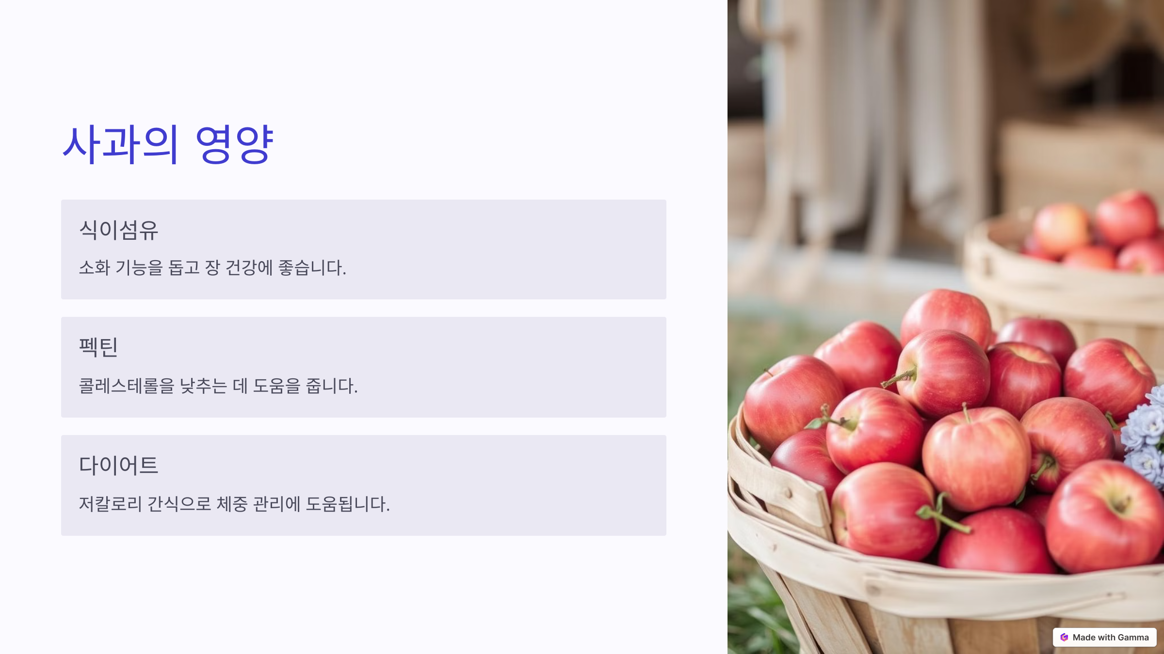 사과는 가을부터 겨울까지 가장 맛있게 즐길 수 있는 대표적인 과일입니다.