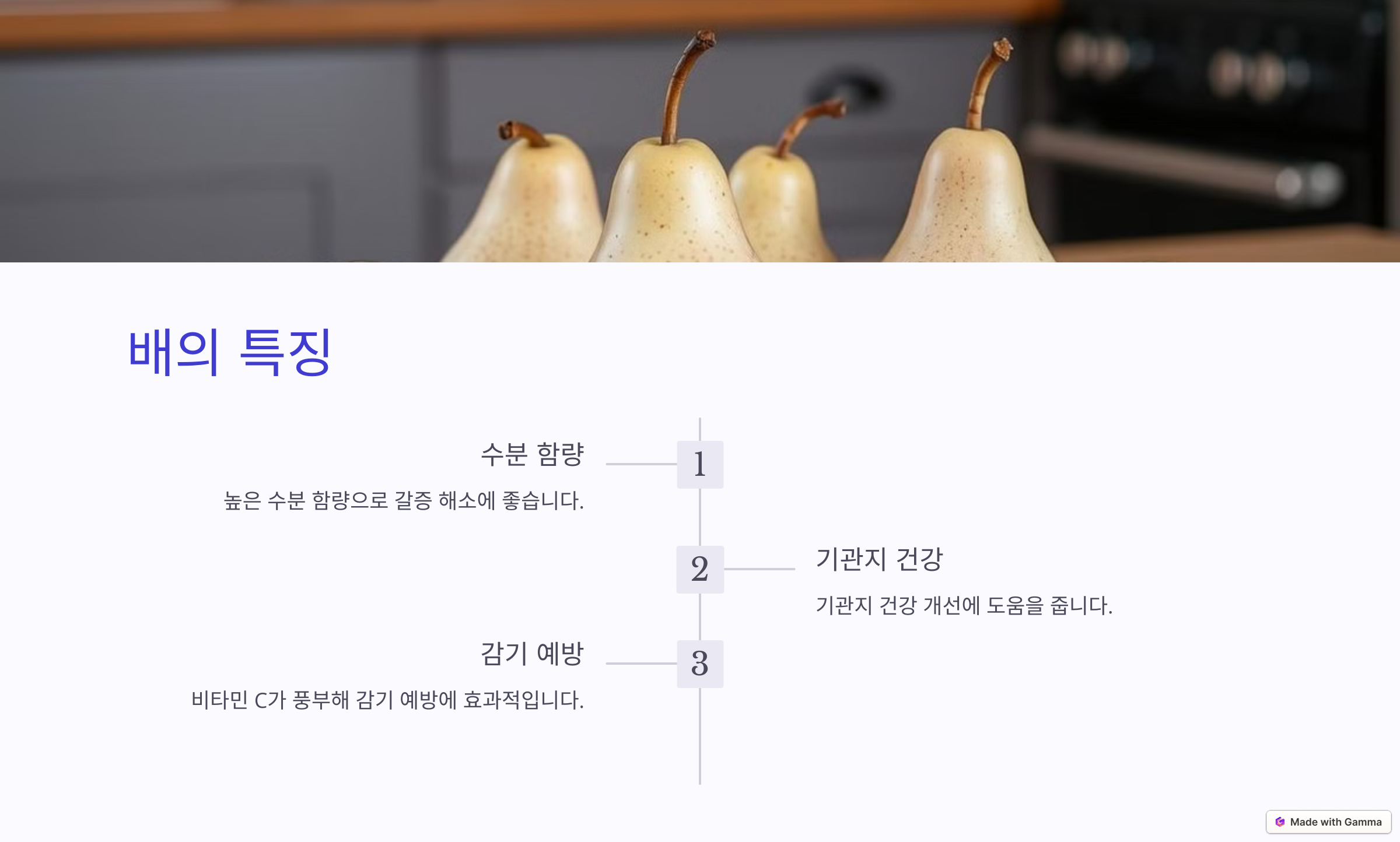 배는 수분 함량이 많아 갈증을 해소하는 데 좋고, 기관지 건강에 도움을 줍니다.