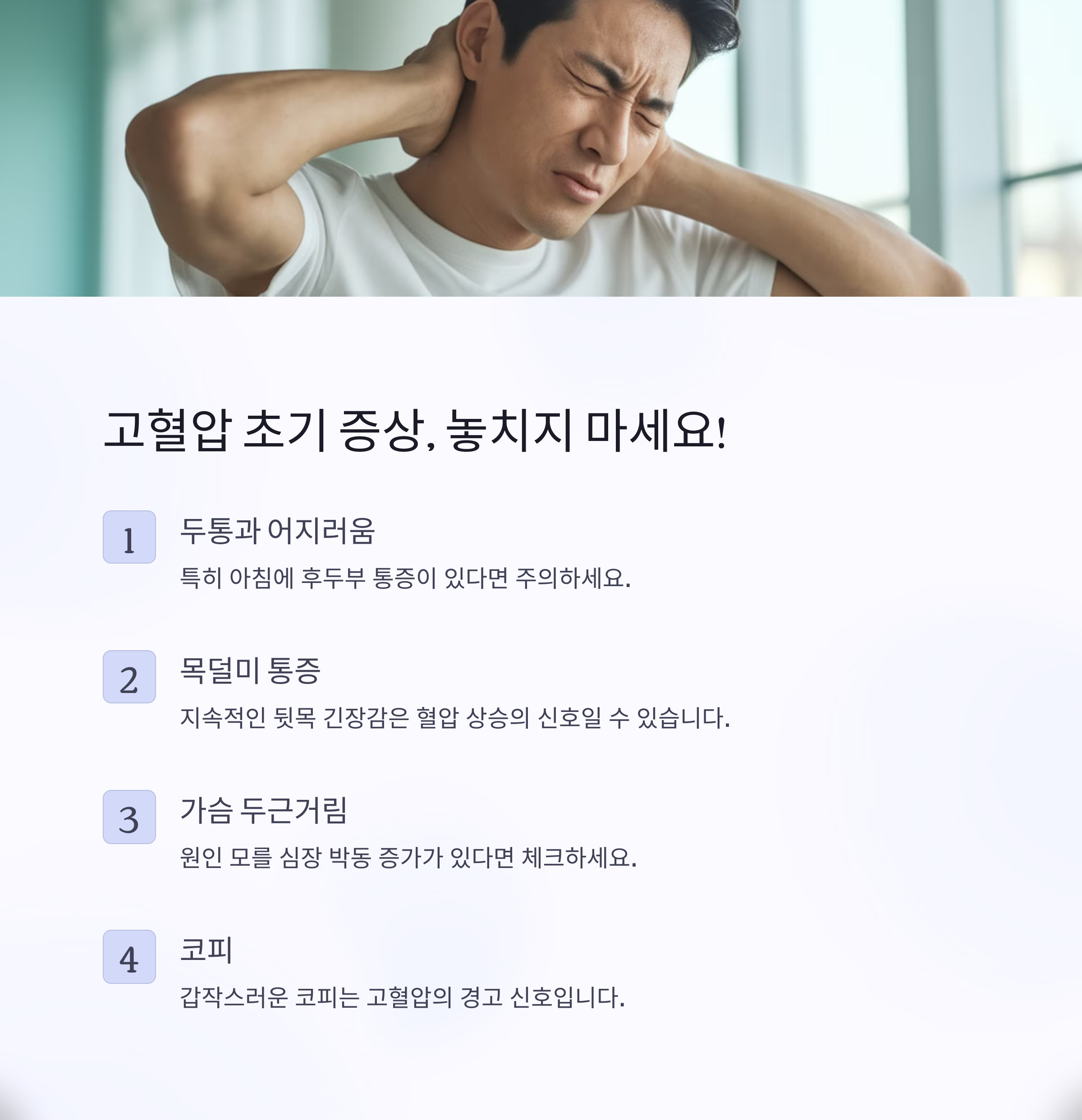 이런 증상들은 혈압 상승과 직접적인 관련이 없는 경우도 많아 쉽게 간과되는데요. 하지만 흉통, 호흡곤란, 시야 장애 같은 심각한 증상이 있다면 즉시 병원을 방문해야 합니다.
