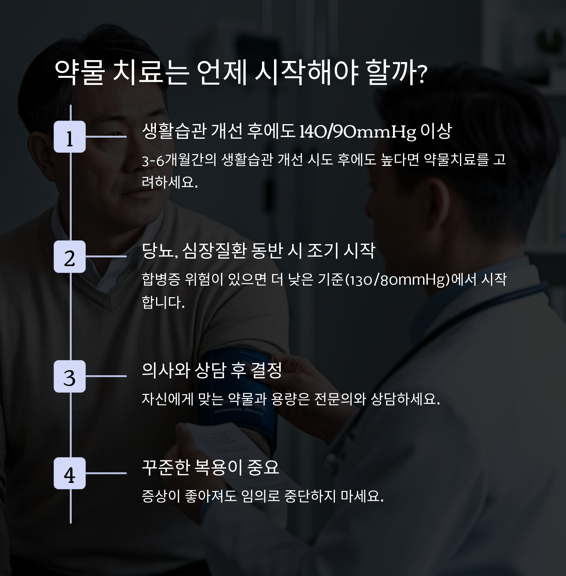 고혈압 약물 치료는 수축기 혈압이 140mmHg 이상일 때 시작합니다.