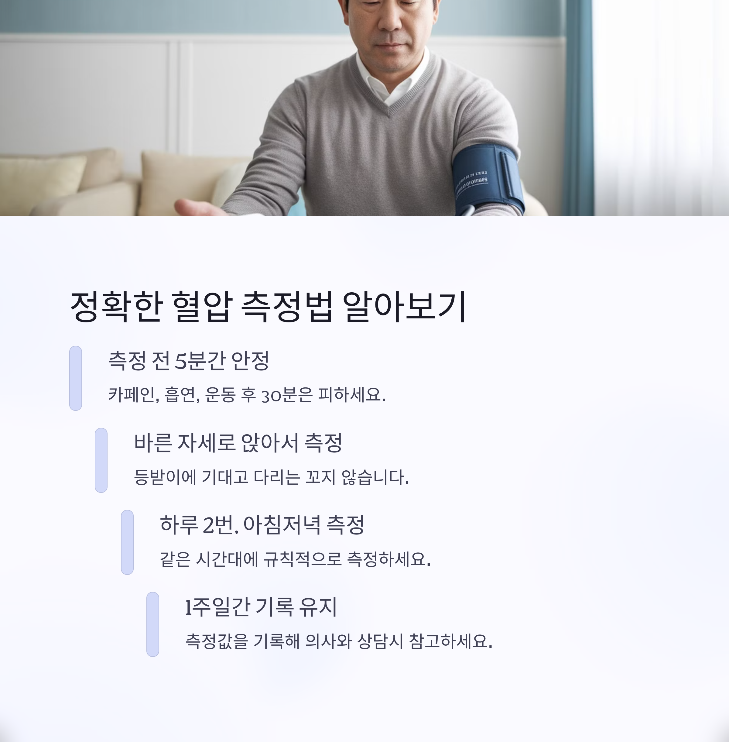 측정 전에는 담배와 커피를 피하고 최소 5분간 안정된 상태에서 측정하세요. 병원에서만 높은 '백의 고혈압'이나 일상에서만 높은 '가면 고혈압'도 있으니 가정에서 주기적으로 혈압을 체크하는 것이 중요합니다.