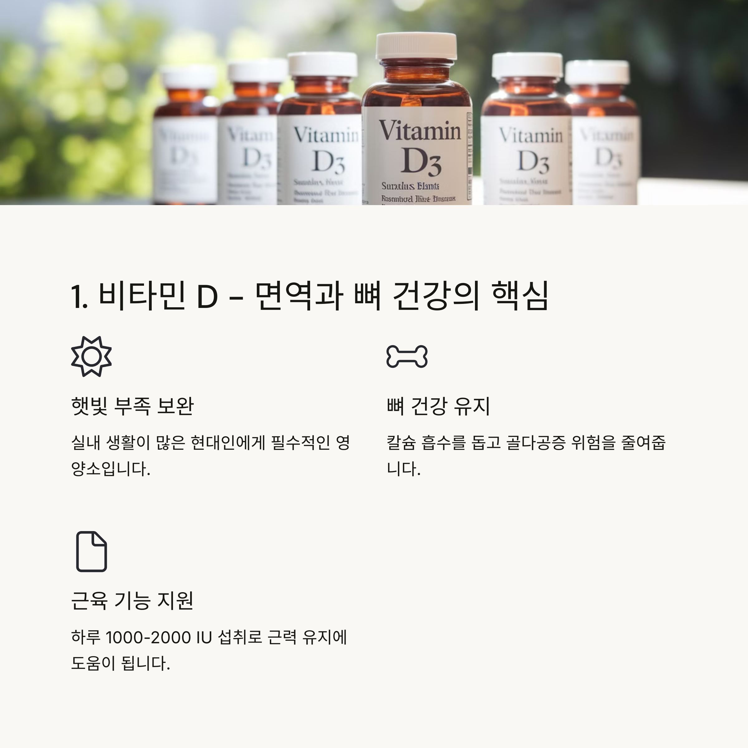 특히 실내 활동이 많은 현대인들에게 비타민 D 결핍은 흔한 문제인데, 이는 뼈 건강, 면역 기능, 그리고 테스토스테론 생산에 중요한 역할을 합니다. 이 두 가지를 기본으로 시작한 후, 개인의 건강 상태와 필요에 따라 다른 영양제를 추가하는 것이 좋습니다.