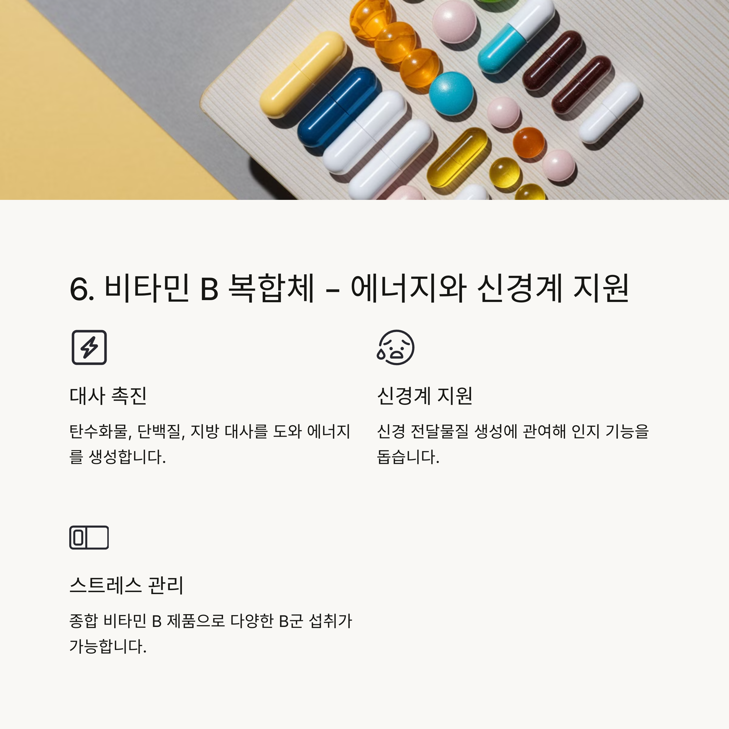 - 비타민 B 복합체: 에너지 대사와 신경계 기능을 지원하는 B 비타민은 스트레스 관리와 집중력 향상에 도움을 줍니다. 특히 B12는 나이가 들수록 흡수율이 떨어지므로 보충이 중요합니다.