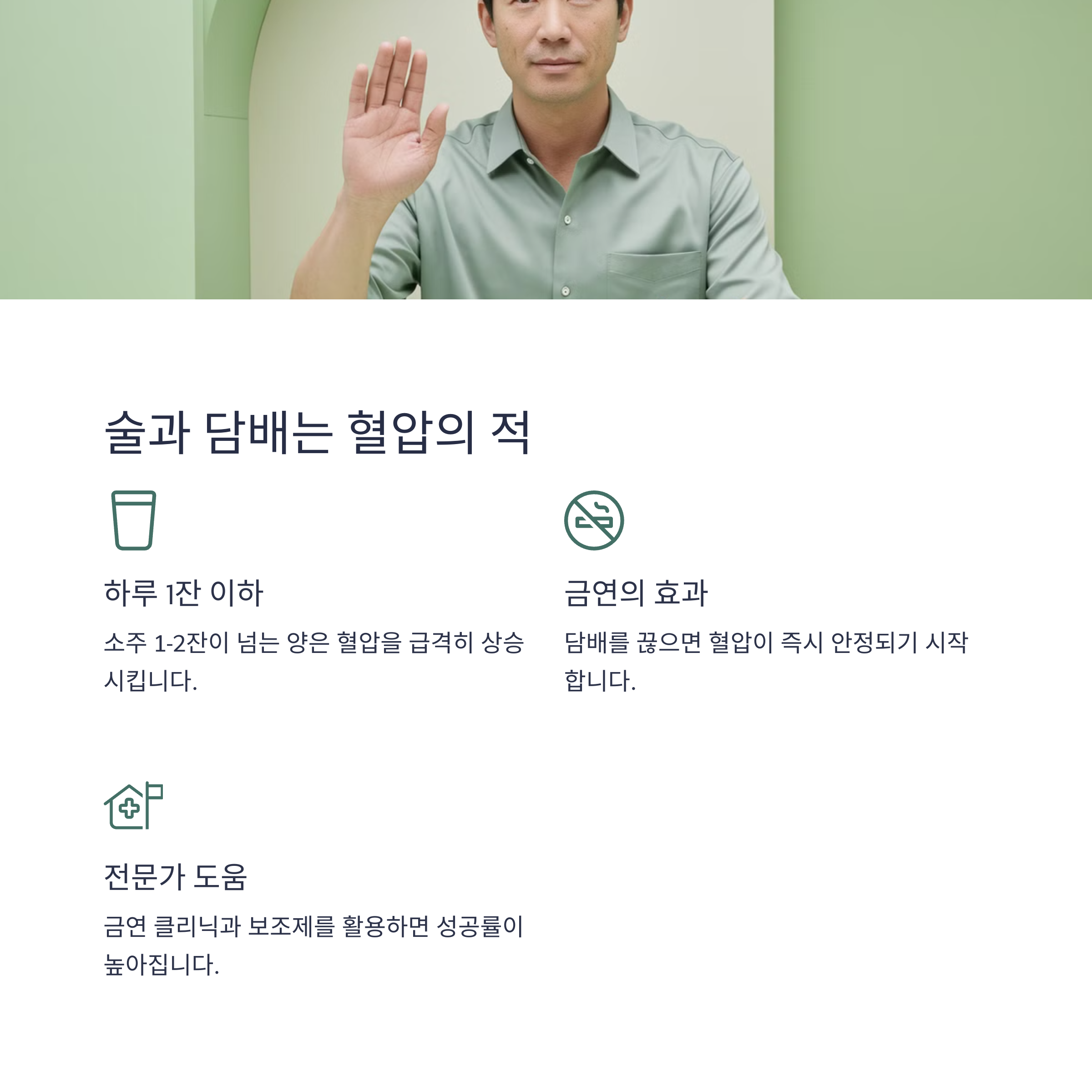 술과 담배는 혈압 상승의 대표적인 원인이죠? 술은 하루 맥주 한 병 이하로 줄이고 담배는 반드시 끊어야 합니다! 처음엔 힘들겠지만 건강을 위해 꼭 실천해 보세요!