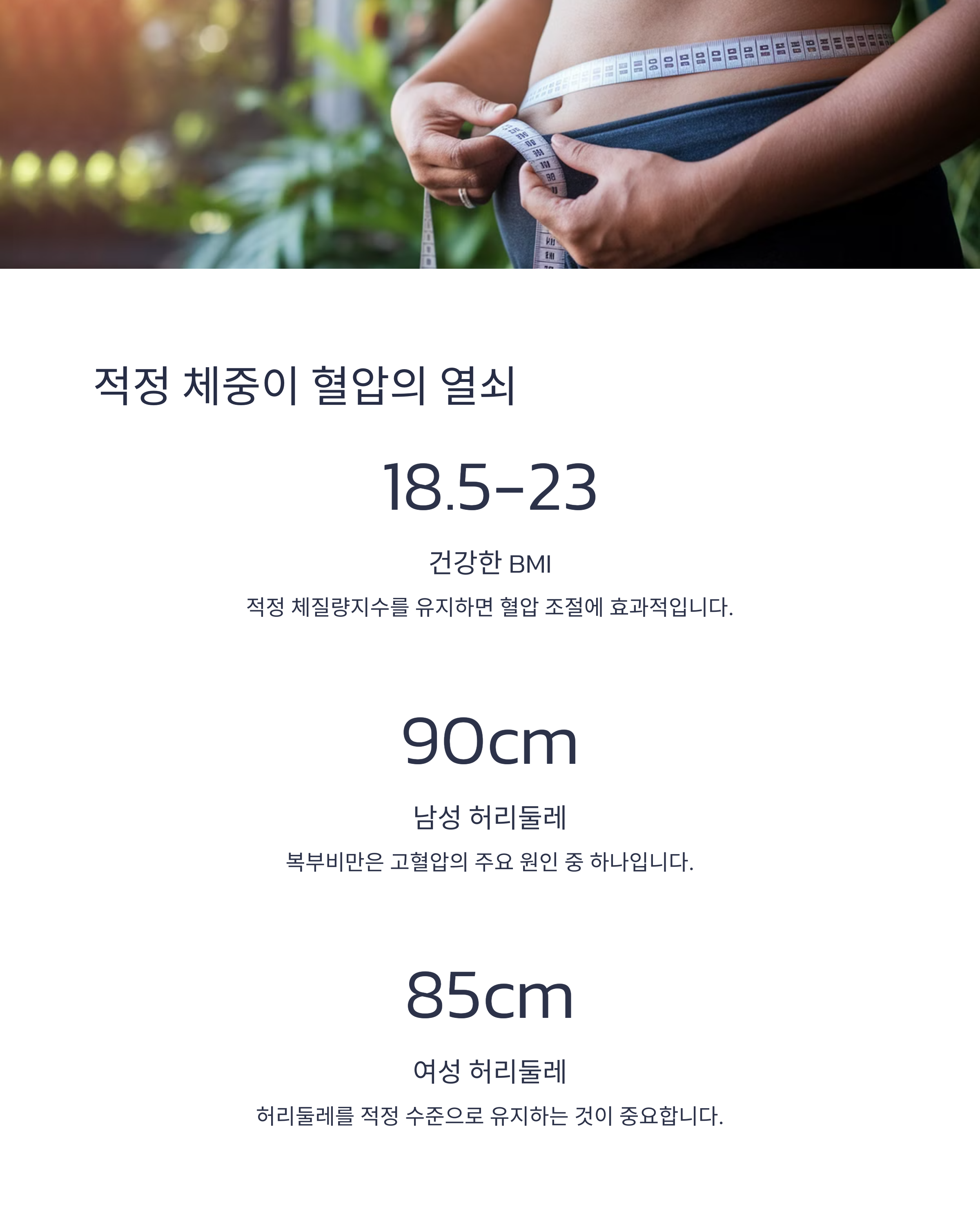 비만이나 과체중은 혈압 상승의 주요 원인이에요. 따라서 체중 감량이 필수입니다! 하루 세 끼 규칙적으로 챙겨 먹되 천천히 드시고, 간식이나 군것질을 줄이는 습관을 들여보세요. 특히 빵이나 과자 같은 간식 대신 견과류나 저지방 유제품을 추천드려요.