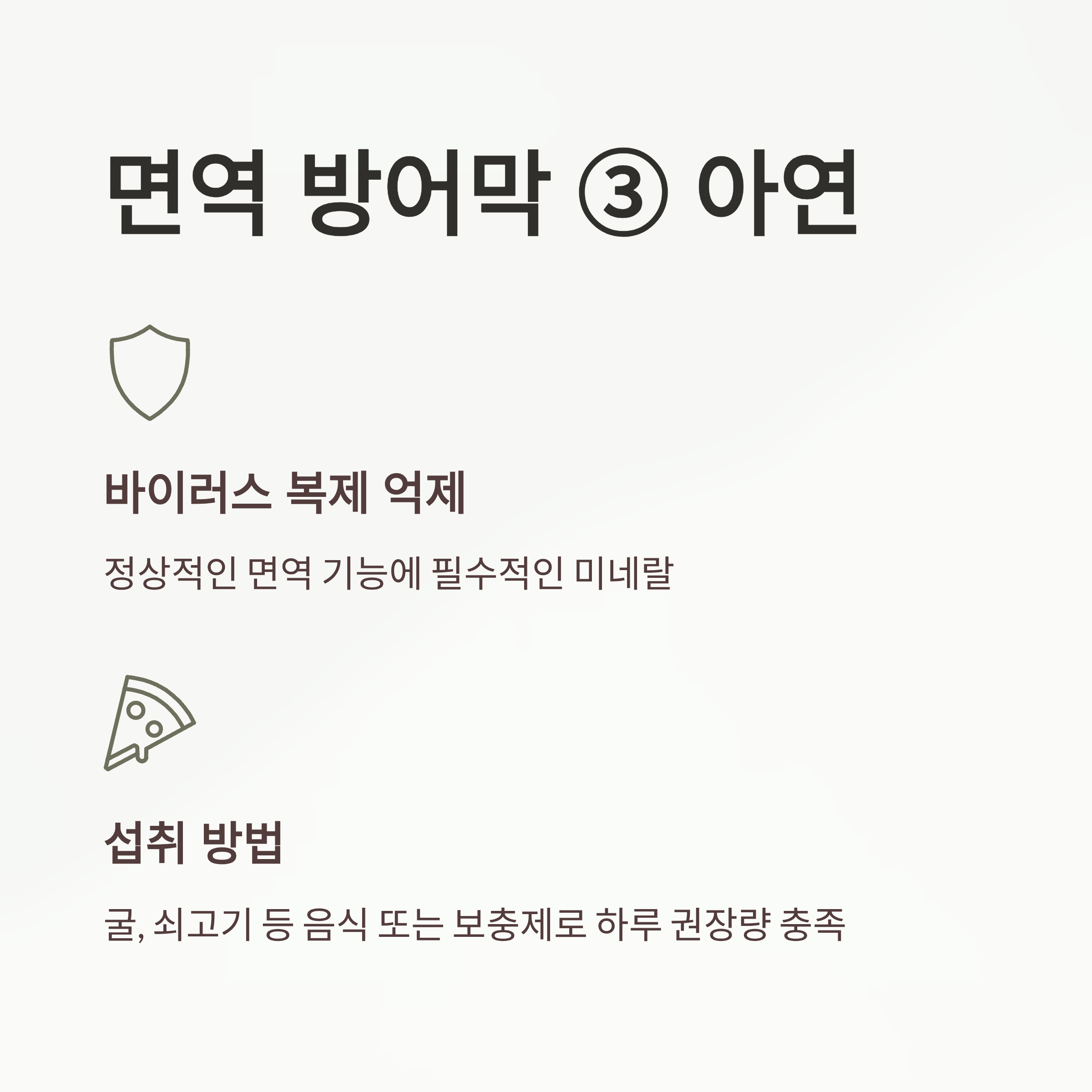 아연은 정상적인 면역 기능에 필수적인 미네랄로, 바이러스 복제를 억제하는 효과가 있습니다. 굴, 쇠고기 등 음식으로 섭취하는 것이 가장 좋지만, 어렵다면 보충제를 통해 하루 권장량을 채워주세요.